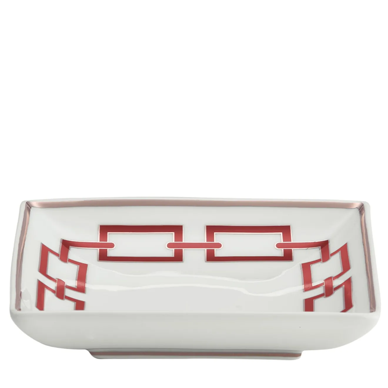 Utilizzata come svuotatasche, oggetto decorativo o piccolo pezzo da portata, questa squisita ciotola quadrata sarà una splendida aggiunta a un arredamento sofisticato. Interamente realizzata a mano in ceramica, vanta una minuziosa decorazione rossa e bordi dorati che ricordano un labirinto ipnotico.