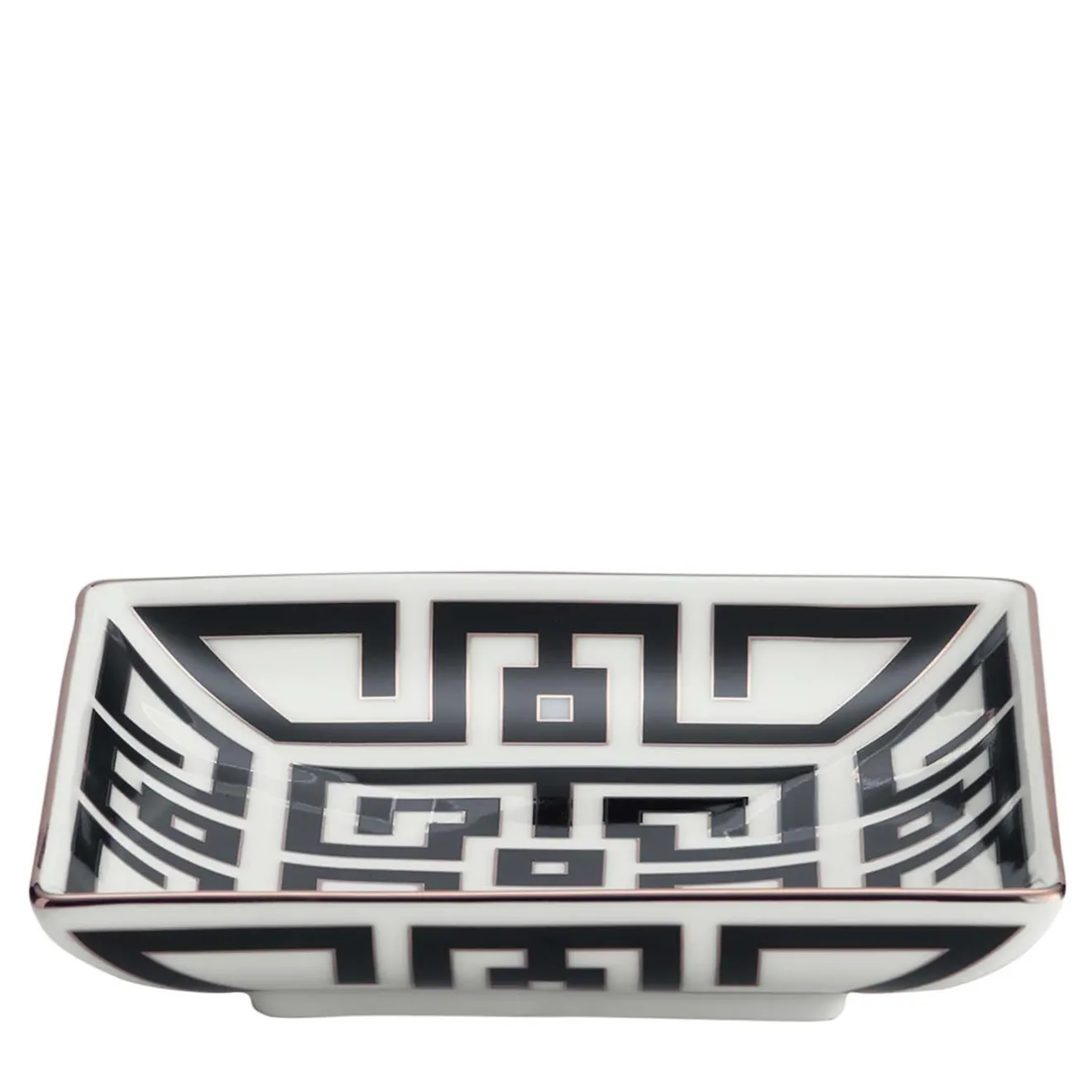 Utilizzata come svuotatasche, oggetto decorativo o piccolo pezzo da portata, questa squisita ciotola quadrata sarà una splendida aggiunta a un arredamento sofisticato. Interamente realizzata a mano in ceramica, vanta una minuziosa decorazione nera e bordi neri che ricordano un labirinto ipnotico.