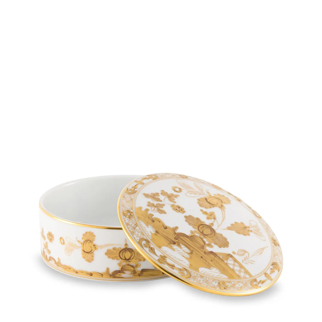 Il grande portagioie in porcellana con decoro Aurum della collezione Oriente Italiano Gold mostra l’eleganza della porcellana bianca impreziosita da oro zecchino dipinto a mano. Caratterizzato da un delicato motivo floreale ispirato al Garofano, riflette l’intramontabile maestria di Ginori 1735. Parte di una collezione che comprende servizi da tavola, set da tè e caffè e diffusori d’ambiente, è disponibile anche in Rubrum, con accenti rossi e oro per interni di grande effetto.