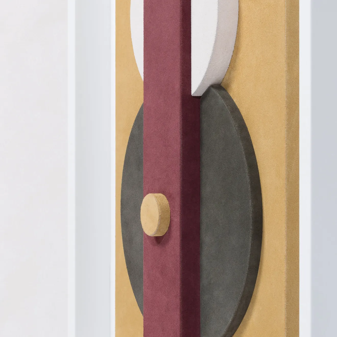 Parte della serie di sculture da parete Tabou, che combina stili Space Age e di ispirazione tribale, questo esclusivo pezzo d’arredamento è interamente rivestito in pelle: morbida nappa bianca per la cornice rettangolare e delicato camoscio per le forme geometriche che formano il disegno astratto. Il pezzo centrale presenta uno sfondo ocra con due cerchi, uno nero e l’altro bianco, intersecati da un listello rosso con un piccolo cerchio ocra. Questa opera d’arte unica si concentra essenzialmente sul gioco di forme e colori puri espressi attraverso un mezzo – la pelle – relativamente nuovo per le decorazioni murali.