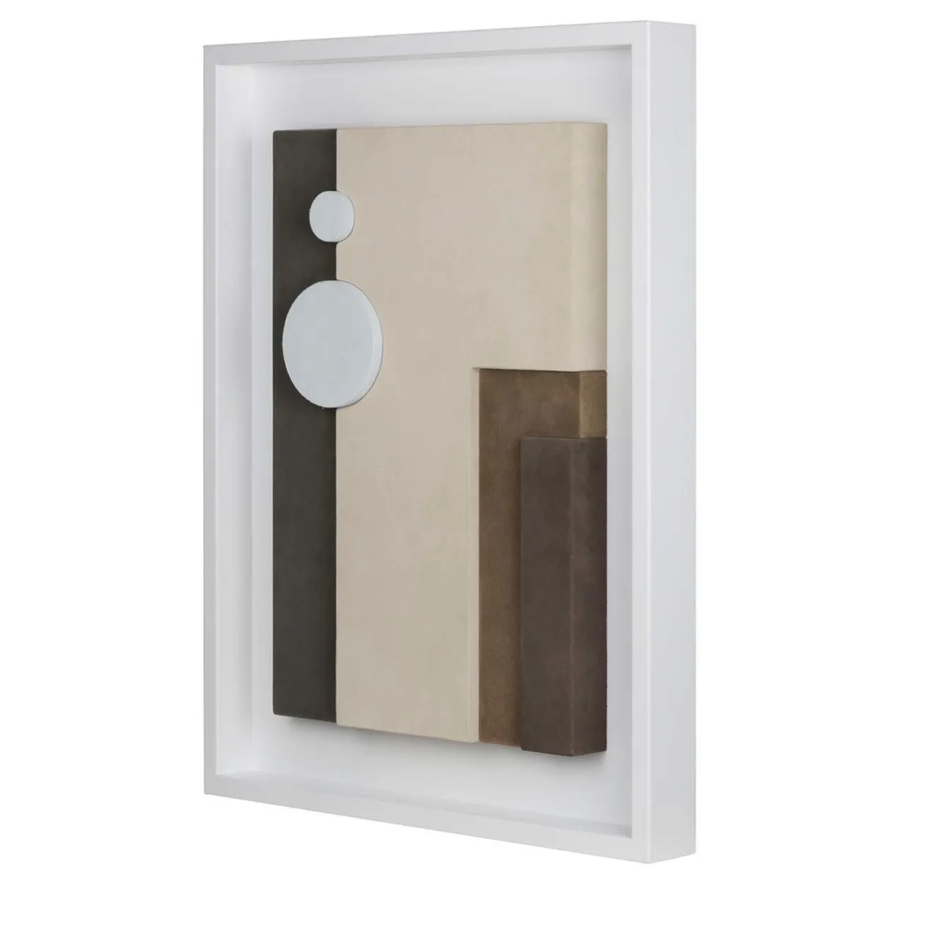 Caratterizzata da forti linee geometriche e da un carattere architettonico, questa eccezionale scultura da parete disegnata da Stephane Parmentier è una testimonianza della scultura astratta modernista. Una serie di camosci dai toni neutri ricopre le forme geometriche, conferendo una lussuosa qualità visiva e testuale: due cerchi bianchi sono circondati da una fascia rettangolare marrone scuro, due fasce a forma di L (beige e marrone chiaro) e una piccola fascia rettangolare marrone chiaro nell’angolo in basso a sinistra. Montato su una cornice rettangolare in nappa bianca, questo pezzo infonderà un’atmosfera unica in un arredamento minimalista.