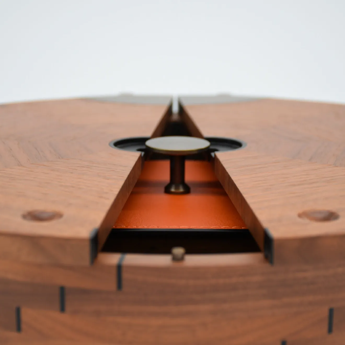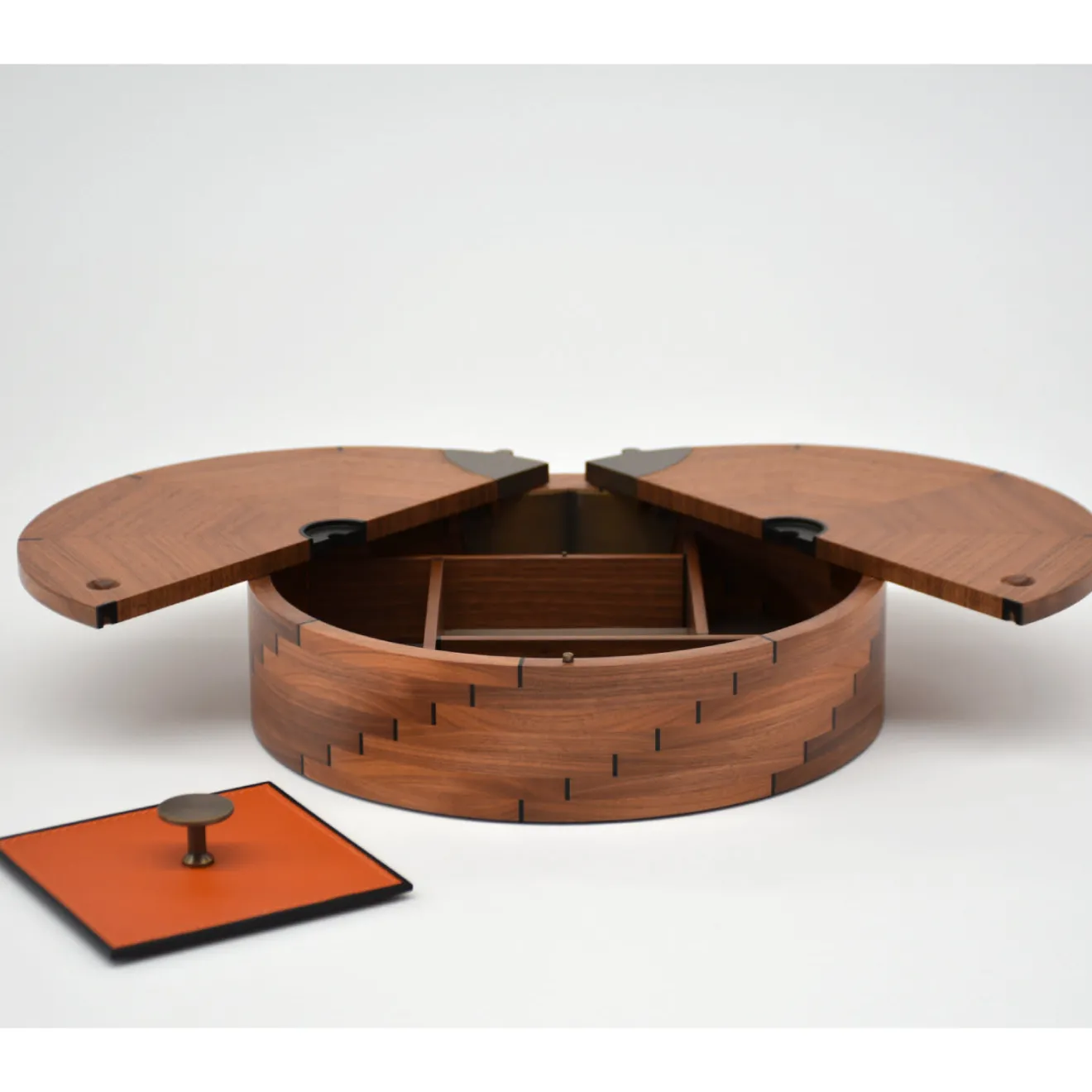Questo affascinante cofanetto è realizzato a mano in noce con una forma ispirata alla coccinella, simbolo di fortuna e prosperità. La base rotonda presenta inserti a coda di rondine in ebano che formano un accattivante motivo geometrico di scale ascendenti. Il coperchio si apre a metà, rispecchiando il movimento delle elitre della coccinella, e si chiude in alto con un pezzo di demilune in ottone bronzato. L’interno, rivestito in pelle, è suddiviso in scomparti e presenta una sezione quadrata al centro con un coperchio rivestito in pelle arancione e fissato con un pomello a forma di spillo. Solo tre pezzi disponibili.