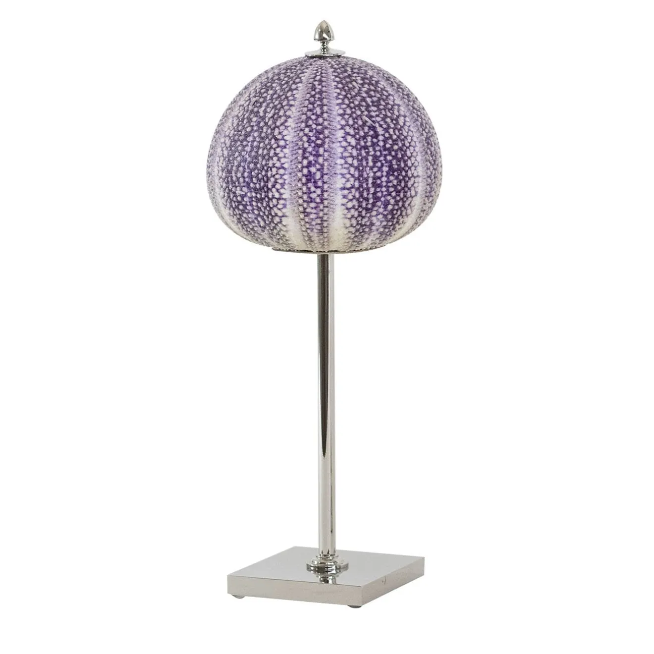 Questa scultura minimalista, che si presta ad arricchire le case costiere più sofisticate, incorpora un vero e proprio pezzo di mare. Un’autentica conchiglia di riccio di mare, di colore viola e bianco, è tenuta in posizione tra un terminale appuntito e una sottile struttura in ottone con piedistallo che, arricchita da una luminosa placcatura in nichel, ne afferma la tranquilla eleganza. Ideale su scrivanie o consolle d’ingresso.