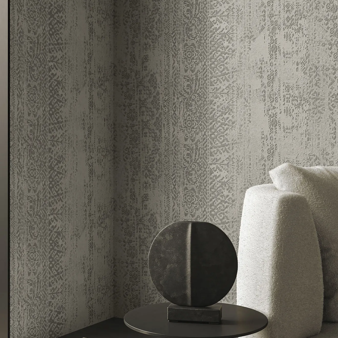 La carta da parati Tracce della collezione Tramae presenta un motivo sottile e in evoluzione che si integra facilmente in vari interni. La sua superficie cambia con la luce, apparendo uniforme da lontano mentre rivela dettagli delicati e imperfetti a un’ispezione più ravvicinata. Ispirato ai tappeti annodati a mano, il design reinterpreta motivi tradizionali con un approccio contemporaneo, evocando superfici usurate dove frammenti di motivi emergono come ricordi persistenti. La carta da parati bilancia elementi geometrici e irregolari, aggiungendo profondità e movimento a qualsiasi parete.