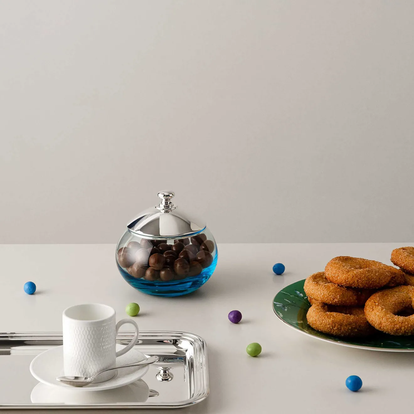 Vaso tondeggiante in cristallo con coperchio in argento placcato, che unisce influenze classiche con un design minimalista. La forma curva e levigata del contenitore, insieme al delicato gradiente blu, aggiunge un tocco di raffinatezza pur mantenendo una semplicità essenziale. Realizzato con eccezionale maestria artigianale, questo pezzo funge sia da pratico contenitore sia da sofisticato elemento decorativo.