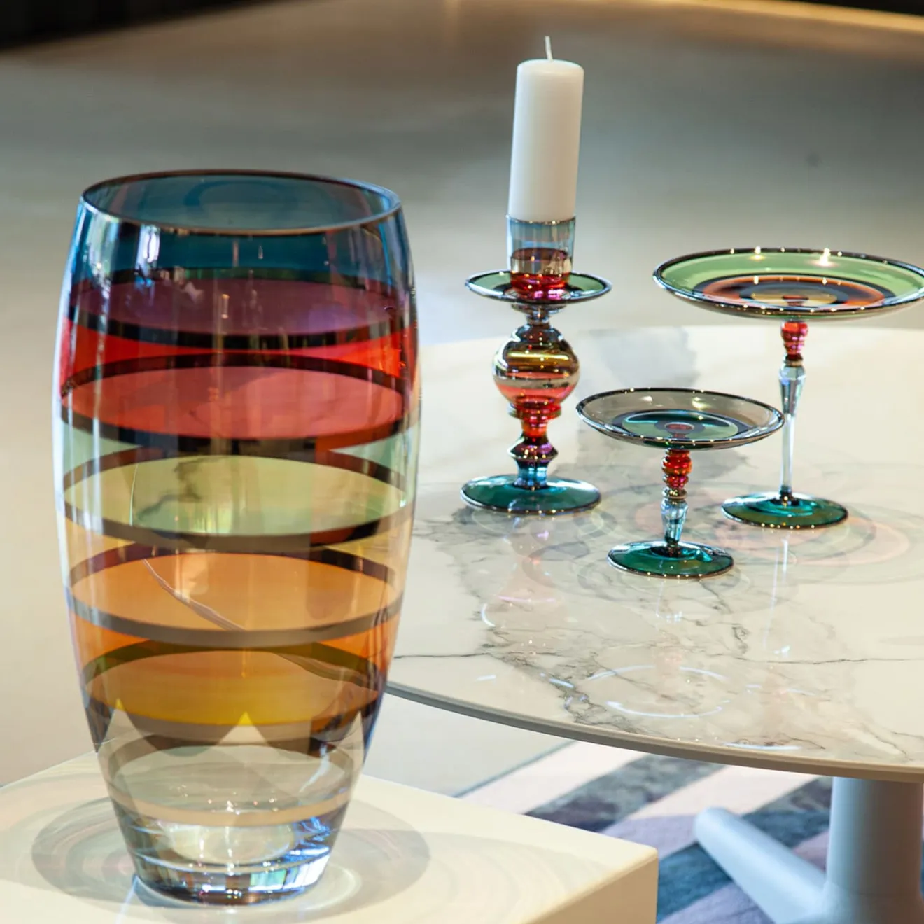 Ispirato alla Torcia Olimpica per il suo corpo sinuoso, questo portacandele in vetro ricco di strisce colorate è un complemento perfetto per i tavoli che necessitano di un tocco di colore. Gli anelli di platino scintillanti conferiscono un’atmosfera lussuosa e amplificano gli splendidi riflessi dovuti alle interazioni tra luce e trasparenze. È anche un omaggio ai Giochi Olimpici di Milano del 2026.