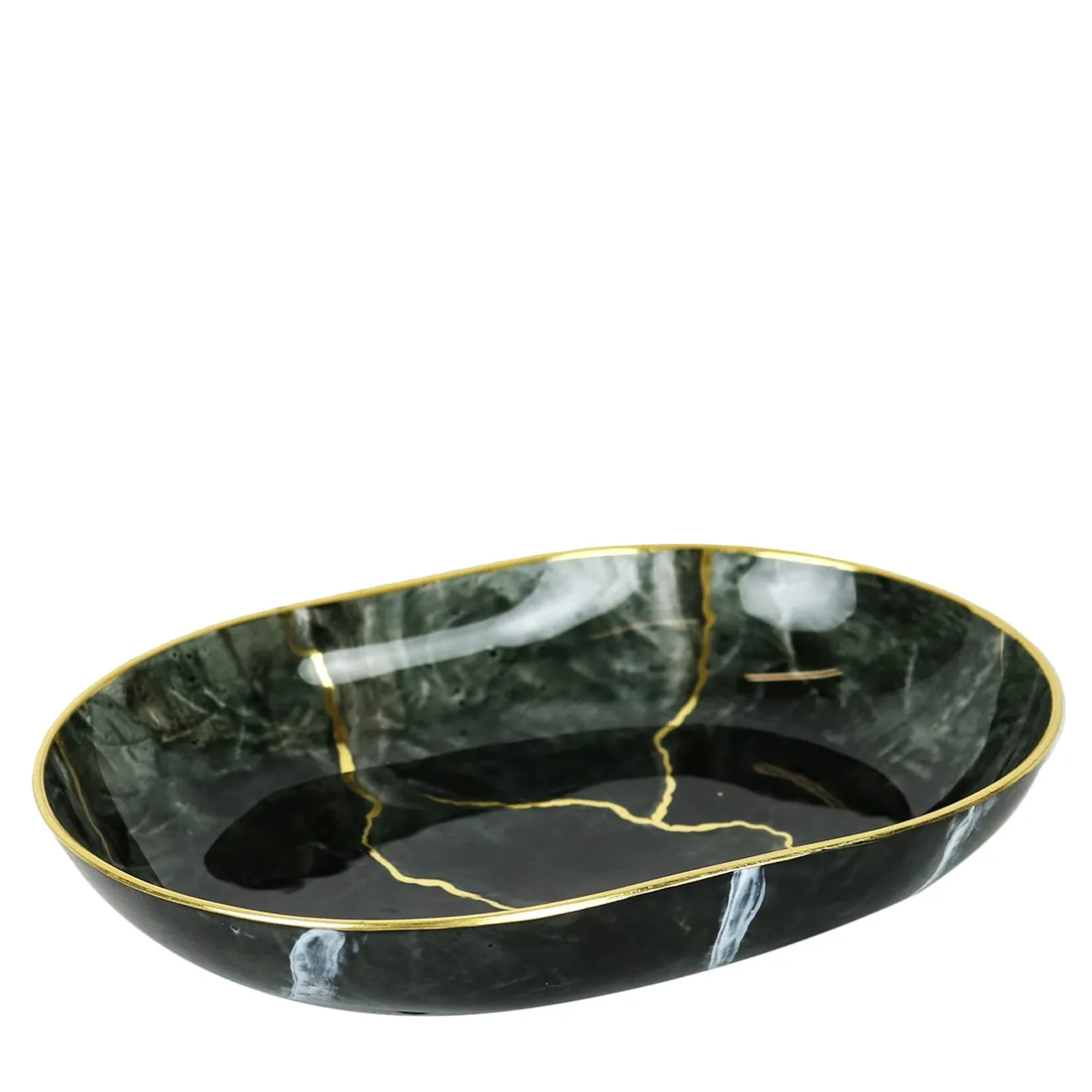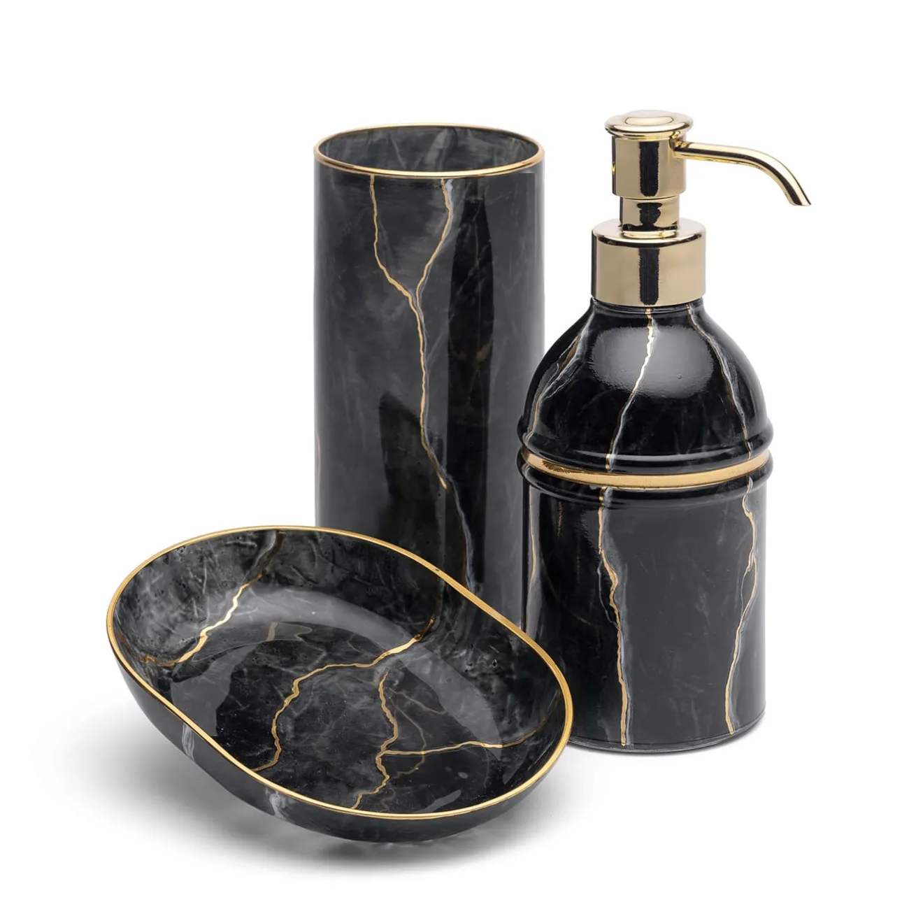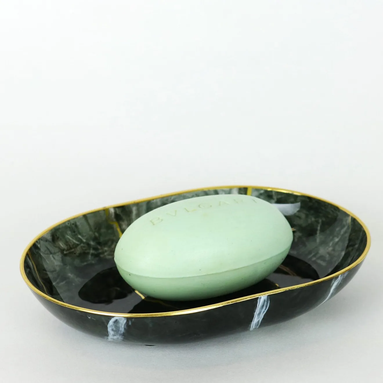 Ispirato all’opulenza del marmo nero di Portoro, questo portasapone in vetro soffiato a mano è un esempio di maestria artigianale. La sua superficie nera lucida, meticolosamente dipinta per imitare le venature del marmo, è arricchita da accenti in oro 24k applicati a mano. Adatto a contenere saponi pregiati, questo pezzo fonde utilità e bellezza senza tempo. Le opzioni di personalizzazione includono altre finiture simili al marmo, offrendo flessibilità per diversi stili di interni.