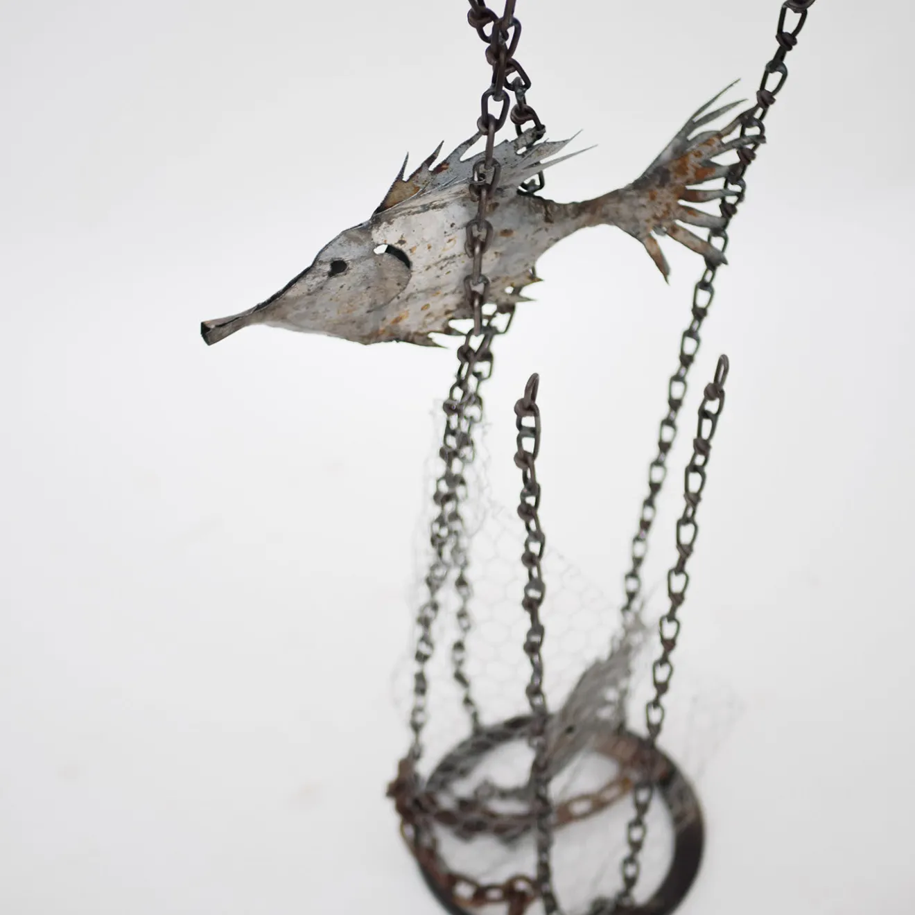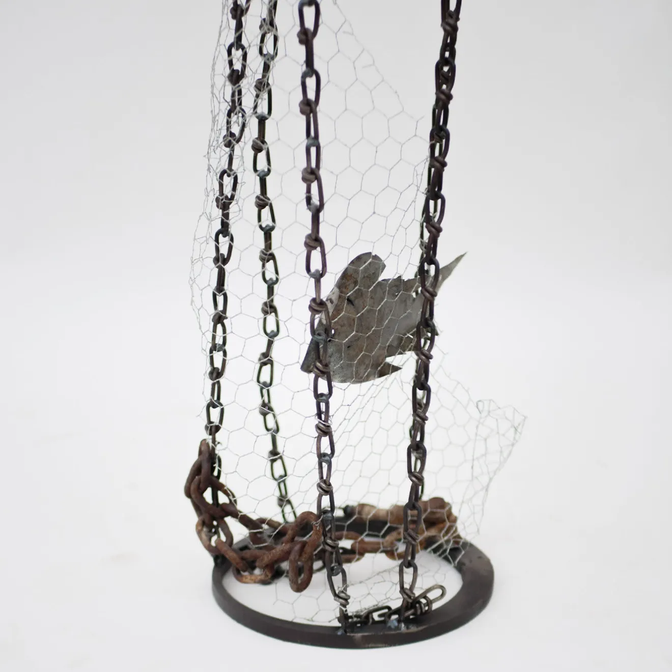 Questa scultura – abilmente realizzata a mano in ferro e con componenti recuperati coerentemente con il tema ecologista – mira a catalizzare l’attenzione dell’osservatore su ciò che si trova sott’acqua, lontano dalla vista. Il danno che lo sfruttamento umano sta causando alla fauna marina è esemplificato dalle catene e dalle reti, che danzano con i pesci in un macabro pas de deux. Raffigurato in modo squisitamente dettagliato, il pesce è messo in mostra in uno stato indifeso, intrappolato nel suo stesso habitat. Un oggetto d’arte con un tocco di consapevolezza.