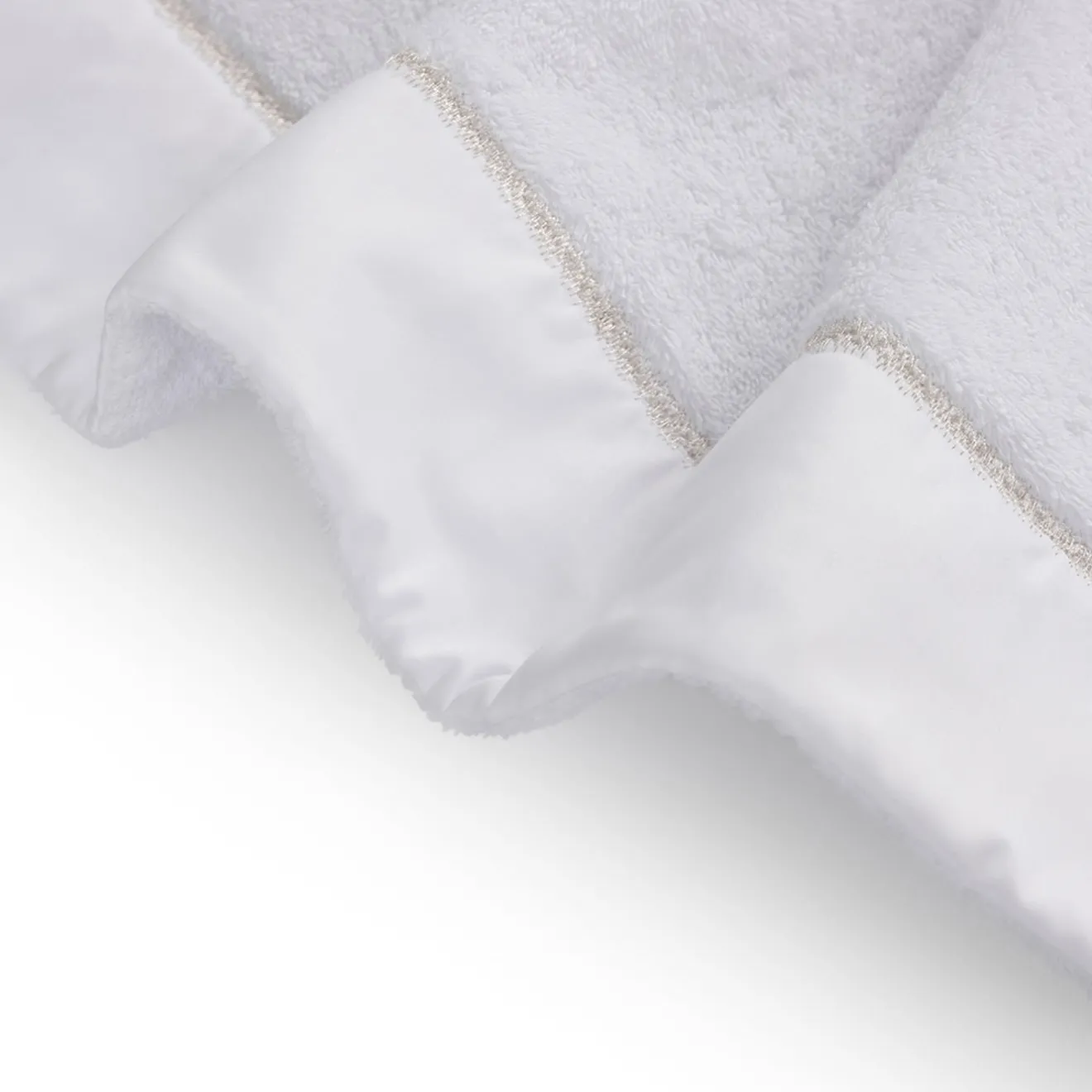 Un prezioso ed elegante set di asciugamano per gli ospiti (40×60 cm), asciugamano per le mani (60×100 cm) e asciugamano per il bagno (110×100 cm) che si adatta ad arredamenti classici e moderni. Ogni pezzo è abilmente realizzato a mano in spugna bianca di prima qualità, impreziosito da una raffinata fascia ricamata in argento satinato che ne esalta l’estetica pulita e morbida.