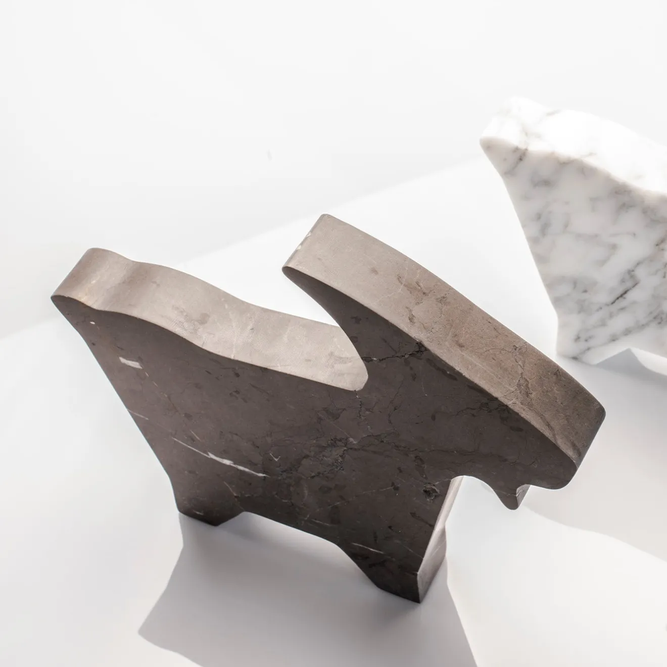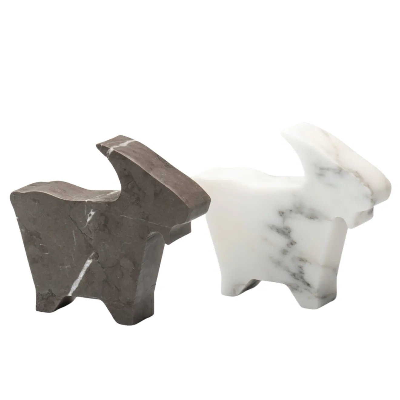 Il profilo stilizzato di una capra definisce il design giocoso di questa statuetta in marmo grigio Grafite, pezzo unico della serie di disegni ironici di Alessandra Grasso. Disponibile in due versioni più grandi e in una variante in marmo bianco di Carrara, mantiene i documenti ben saldi sulle scrivanie con un pizzico di giocosità. L’uso esclusivo del marmo implica il carattere unico di ogni pezzo della Factory Collection, che comprende coniglietti, pecore e maiali.