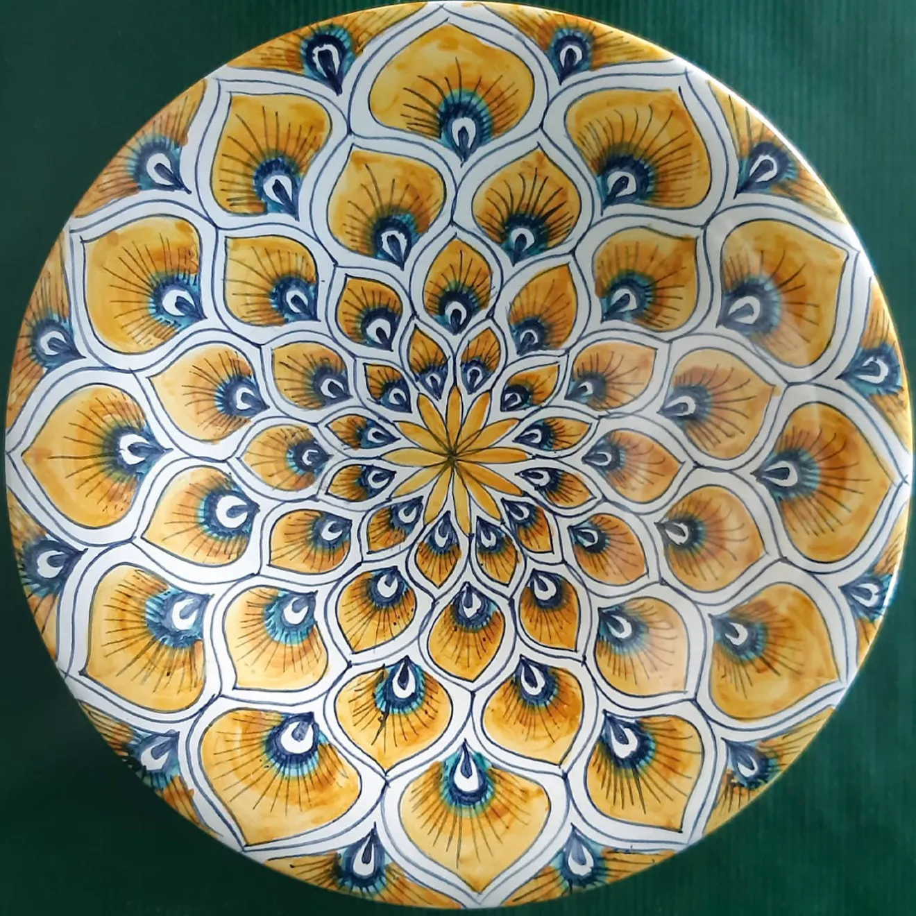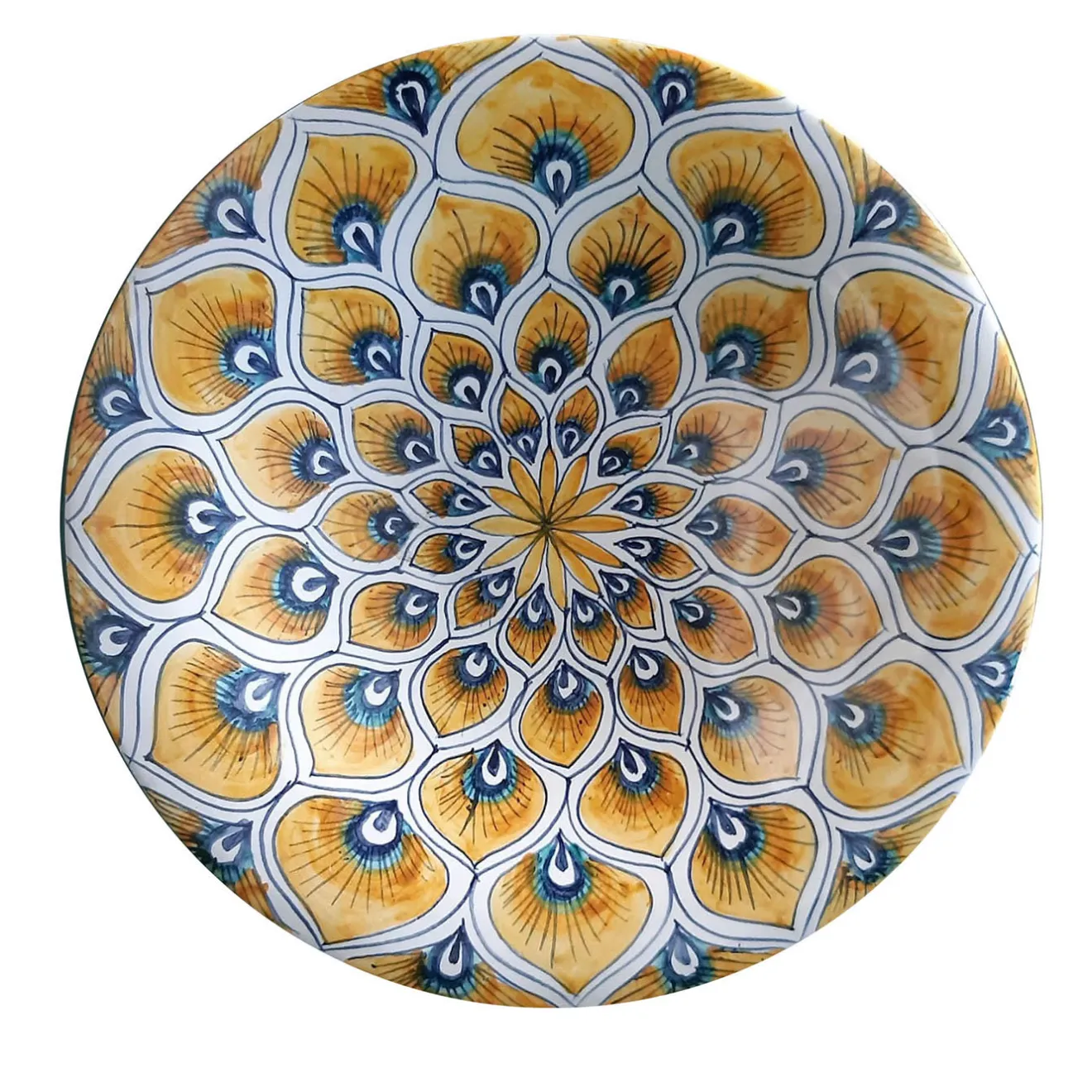 Questo bel piatto decorativo (⌀ 25 cm), realizzato in ceramica di prima qualità, è un esempio della maestria della ceramista Maria Rita Nicolini, che progetta e realizza a mano ogni pezzo. Ornato da un motivo radiale di piume di pavone rese con smalti gialli, blu e neri, il suo sorprendente impatto decorativo gli conferisce il fascino di un oggetto d’arte non replicabile. Può essere esposto anche in coppia in diverse dimensioni, contattando il Concierge.