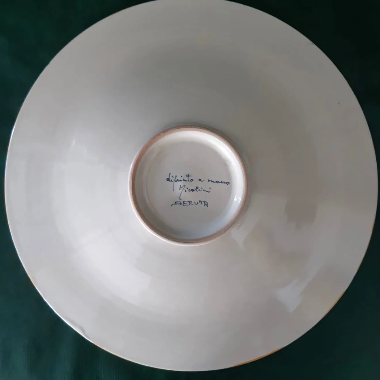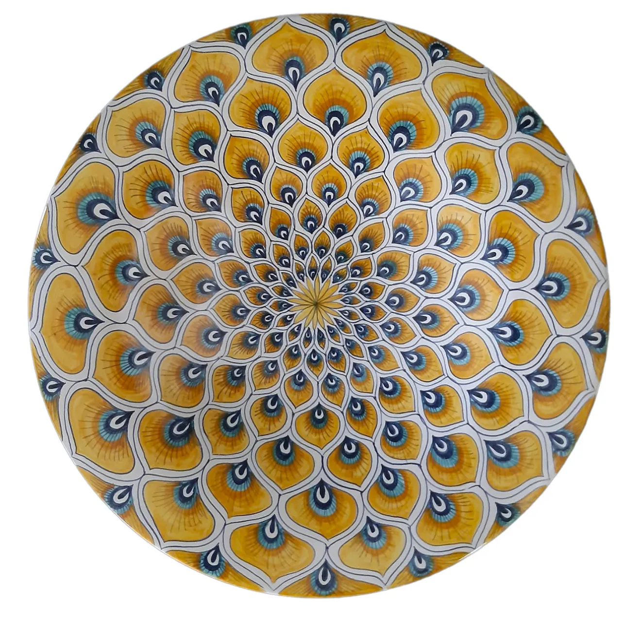 L’impareggiabile maestria della maestra ceramista Maria Rita Nicolini si esprime in questo sublime piatto rotondo decorativo (⌀ 35 cm) che ravviva le pareti monocromatiche degli interni moderni. Il motivo di piume di pavone gialle è dipinto a mano in modo impeccabile con smalti blu, ottenendo un effetto visivo dinamico in cui le piume, disposte in una composizione radiale, sembrano estendersi oltre il bordo del piatto.