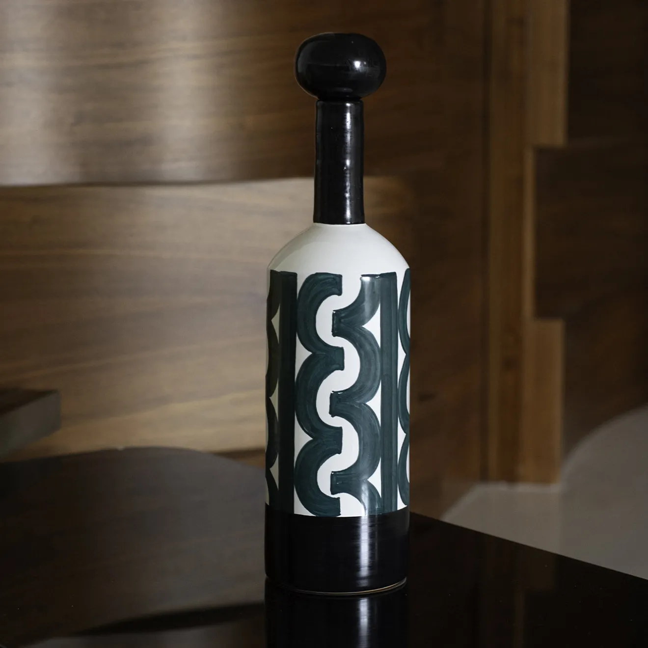 La bottiglia decorativa Bauhaus verde presenta un design distintivo dipinto a mano caratterizzato da audaci motivi geometrici verde profondo su uno sfondo bianco. Ogni pezzo mostra lievi imperfezioni e segni, aggiungendo carattere e autenticità unici. La silhouette slanciata della bottiglia combina estetiche contemporanee con fascino vintage, rendendola un pezzo decorativo straordinario per qualsiasi ambiente interno.