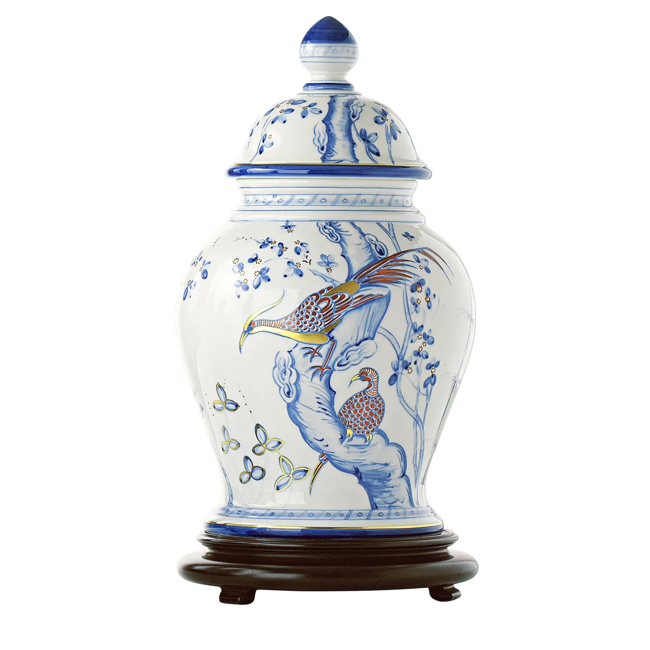 Un design singolare che mette in risalto il fascino innato e luminoso della porcellana bianca contraddistingue questa squisita potiche. Delicati decori blu fanno da sfondo all’accattivante ornamento raffigurante due graziosi fagiani da cui prende il nome l’intera collezione. Dotato di un coperchio a cupola ravvivato da un terminale appiattito, questo pezzo esclusivo poggia su una base a gradini con piedi.