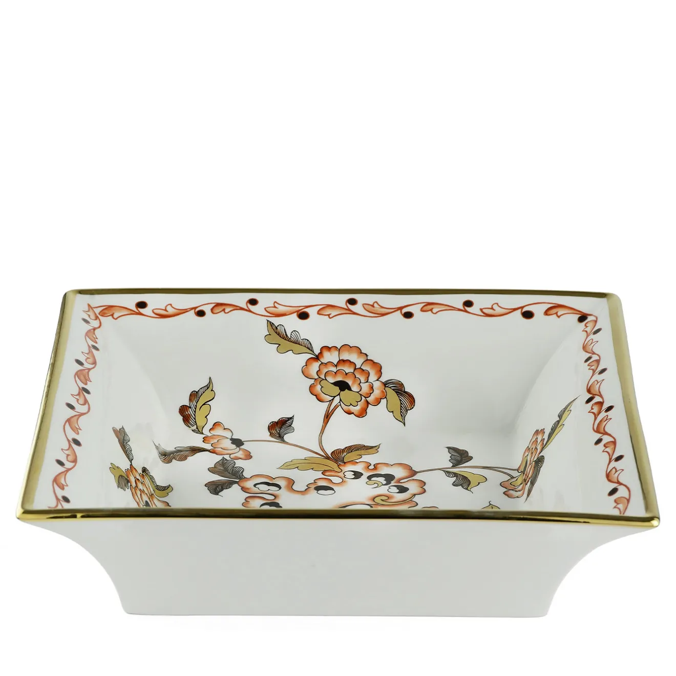 Con un design affascinante e di una raffinatezza unica, questo vassoio da tasca vuoto è equamente realizzato a mano in porcellana bianca, ornato da bordi dipinti a mano in oro 24 carati. Caratterizzato da una silhouette quadrata con lati alti e leggermente svasati, il pezzo è impreziosito da una decorazione di fiori tipica della tradizione cinese.