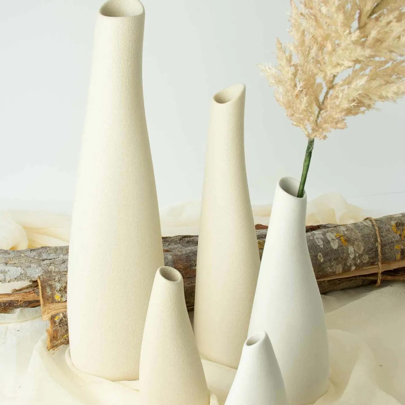 Vasi o bottiglie? Queste cinque raffinate sculture color latte diventano una collezione imperdibile, che porta movimento all’ambiente circostante. Il gioco dinamico di linee morbide e minimaliste conferisce a questi pezzi uno stile raffinato, che rappresenta movimento e fluidità.
