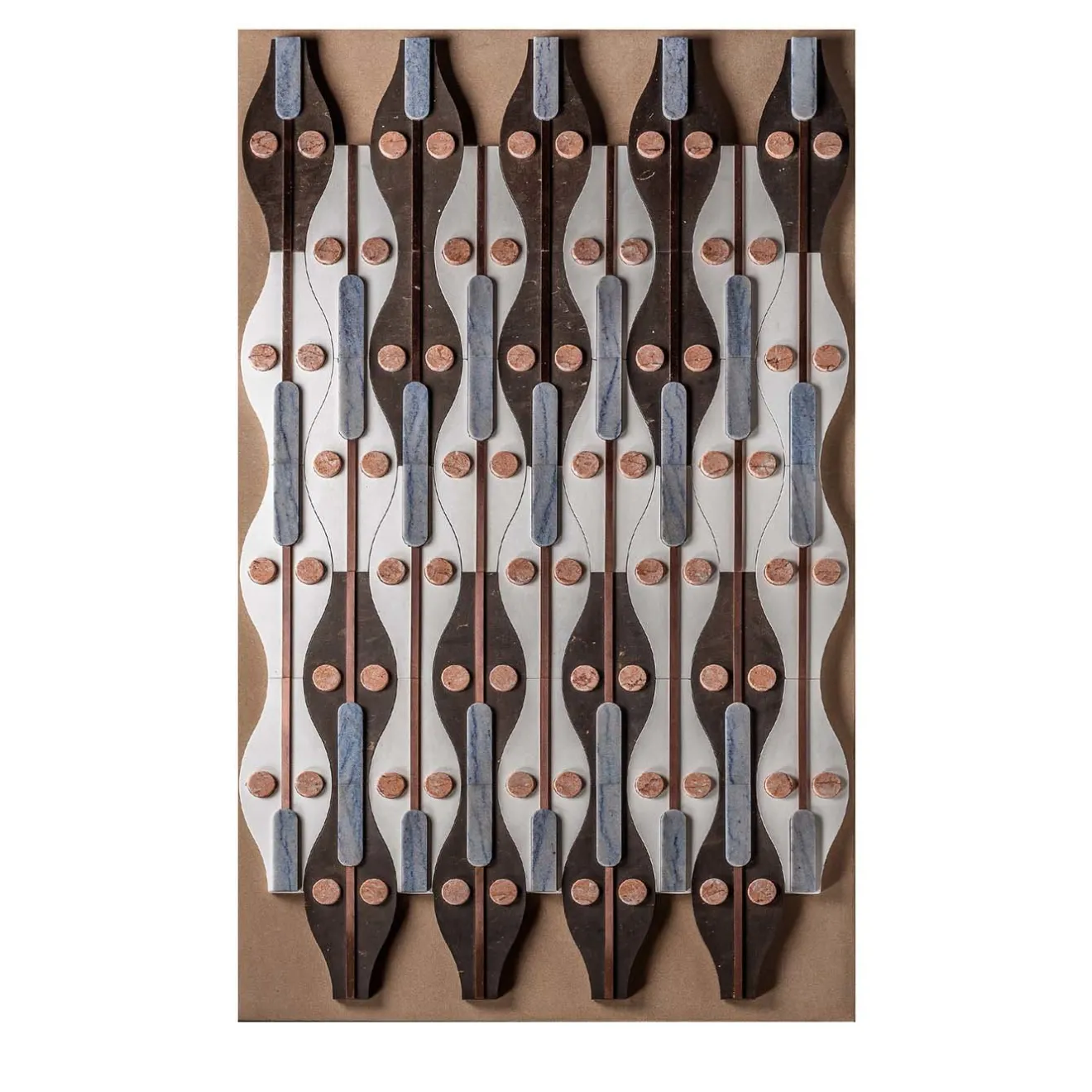 Reinterpretando i mosaici sacri bizantini, queste raffinate tessere della Collezione Bisanzio sono realizzate in Pietra Fenice e Bianco Fenice con finitura levigata, arricchite da cerchi in marmo rosa lucido, rettangoli in marmo macauba azul lucido e strisce di rame con finitura satinata. Il nome Hagia si traduce in “santo” e celebra l’antica raffinatezza. Ogni singola piastrella misura 30x12x2 cm e il pezzo può essere personalizzato nelle dimensioni su richiesta.