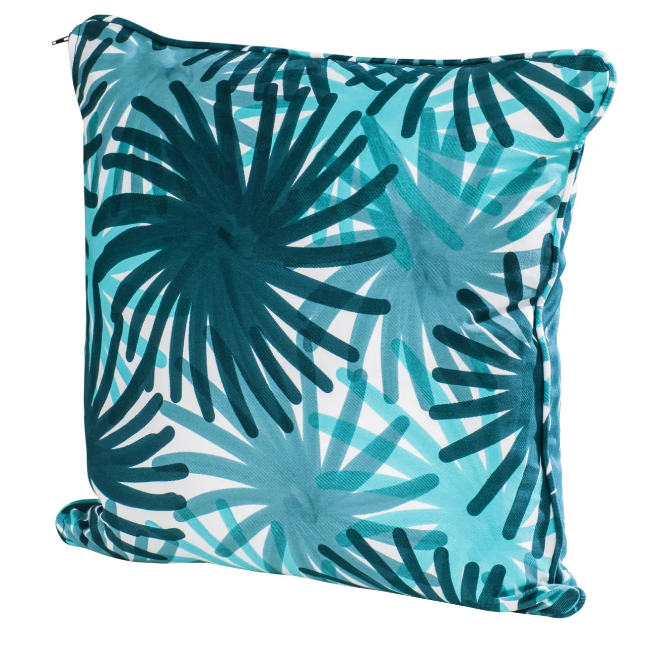 Questo cuscino di grande effetto ha un inserto in piuma d’oca e una fodera in 100% cotone decorata con la tecnica della stampa a pigmenti con un motivo di fuochi d’artificio blu, acqua e turchese.