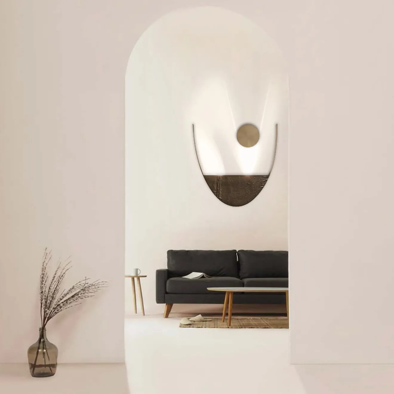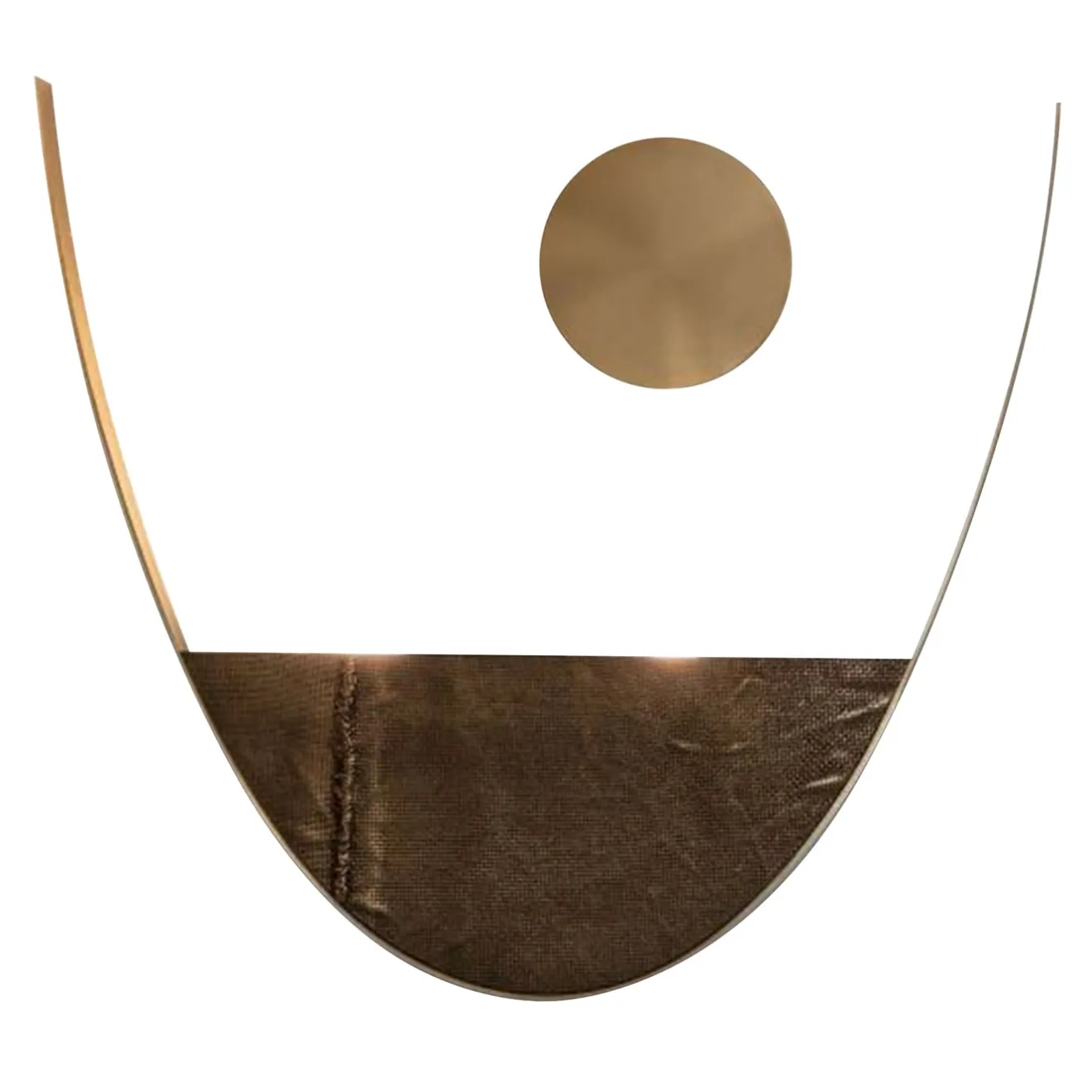 Rompendo ogni confine esistente tra arte e design, questa scultura luminosa conferisce agli ambienti interni un carattere e una raffinatezza senza precedenti. Parte di un’edizione limitata disegnata dall’architetto Isacco Brioschi, presenta un elemento rotondo in ottone bronzato collocato all’interno di una cornice curva, ma separato da essa, riempita in parte di tessuto cristallizzato attraverso il quale la luce risplende.