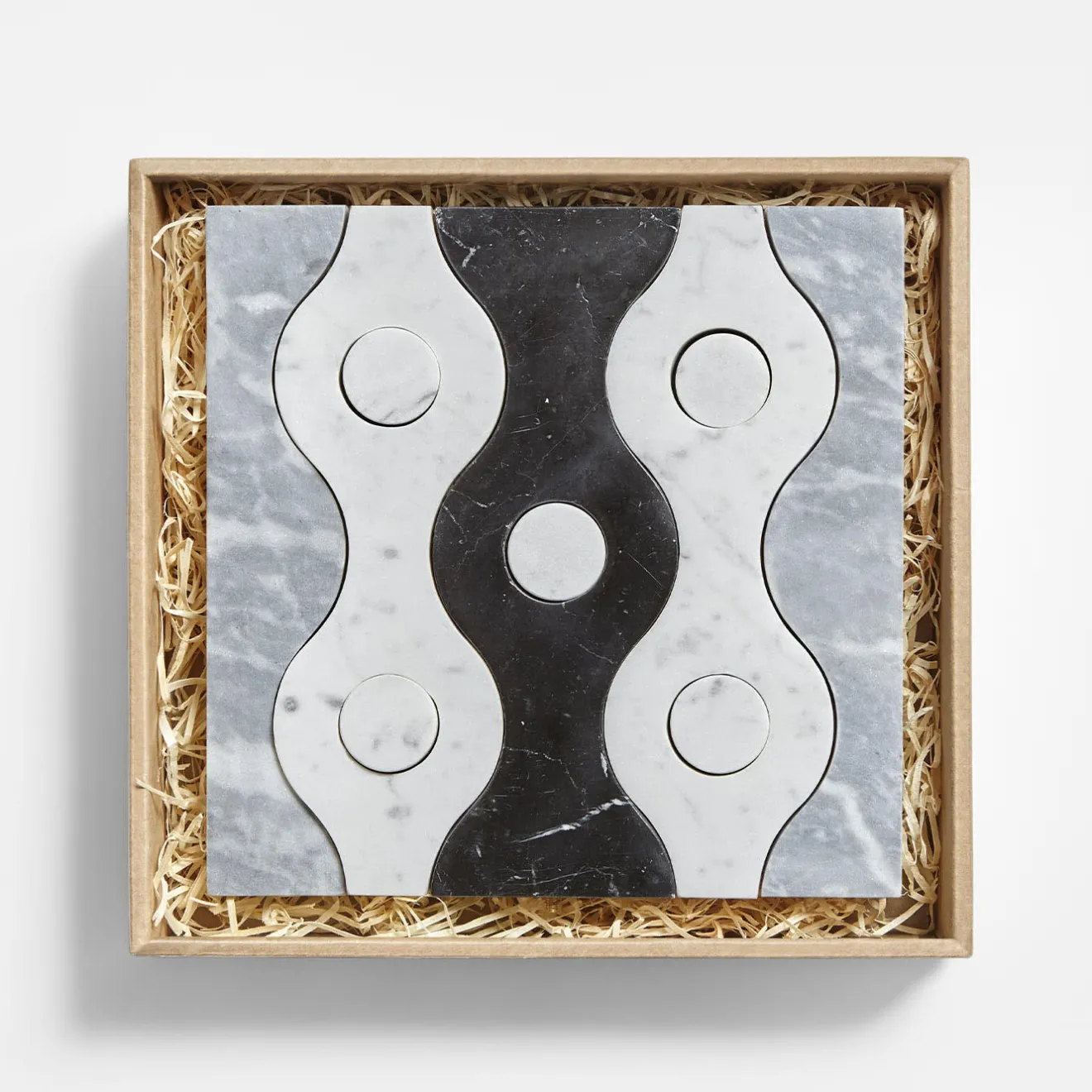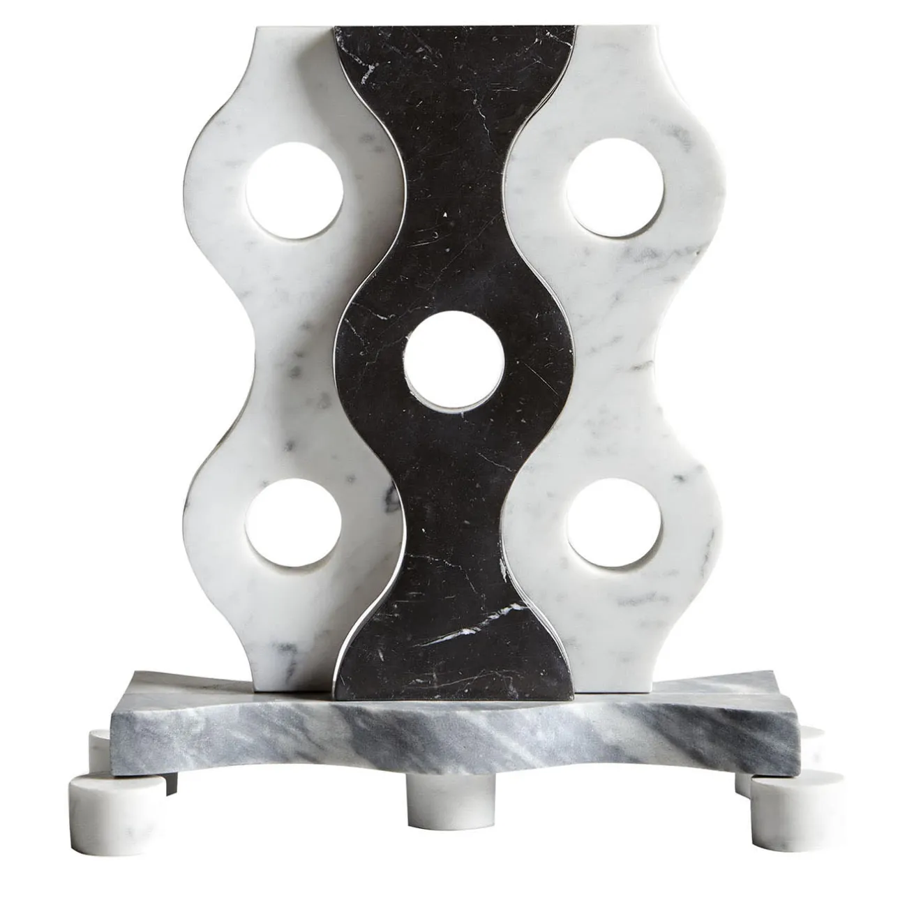 Optic riprende il tema di una scultura itinerante e fa parte della collezione “Marble In Scatola”. Le forme si ispirano alle linee sinuose spesso utilizzate dal designer. In posizione verticale, sembra una piccola quinta. Scomponendola, la piccola scultura diventa piatta come un puzzle che viene riposto nella sua scatola. È realizzata a mano in marmo bianco di Carrara, tortora Bardiglio e nero Marquina.