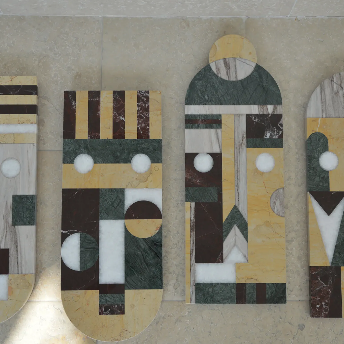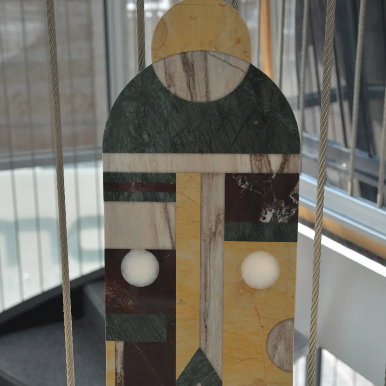 Privo di linee di stuccatura per un effetto liscio, questo accattivante oggetto d’arredo da parete aggiungerà un accento singolare a qualsiasi interno. Come una maschera tribale, diversi tipi di marmo in tonalità contrastanti sono collegati per creare un aspetto drammatico e accattivante. Questo pezzo sarà un elemento di spicco in qualsiasi salotto o studio privato.