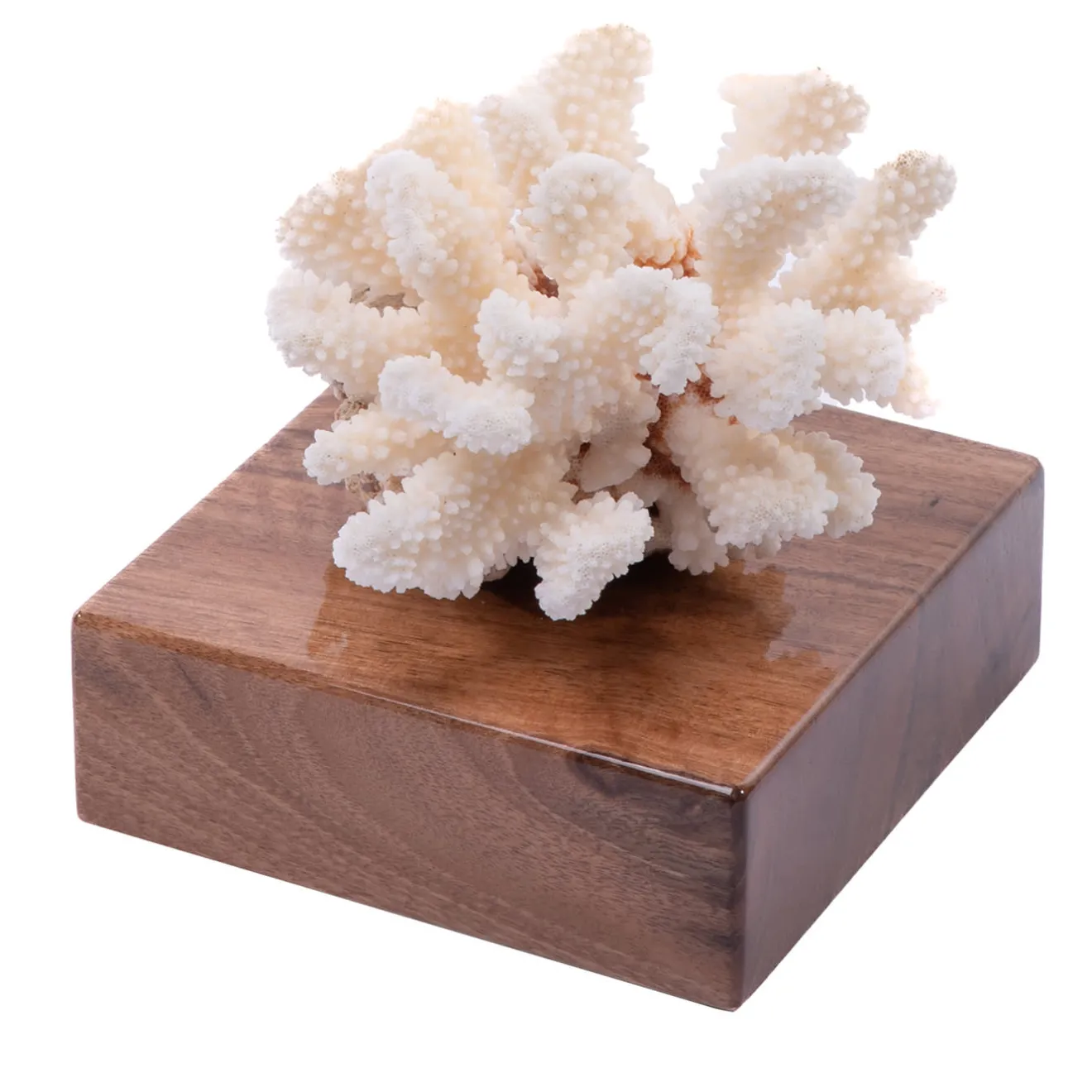Delicato e prezioso, questo oggetto decorativo permette di portare un pezzo autentico del mondo sottomarino sugli scaffali di raffinate librerie o scrivanie come fermacarte. Un singolare esemplare di corallo Pocillopora Meandrina – certificato CITES per l’importazione sicura – seduce con il suo design ramificato contraddistinto da minuscole protuberanze dalla sommità di una preziosa base in noce lucidato.