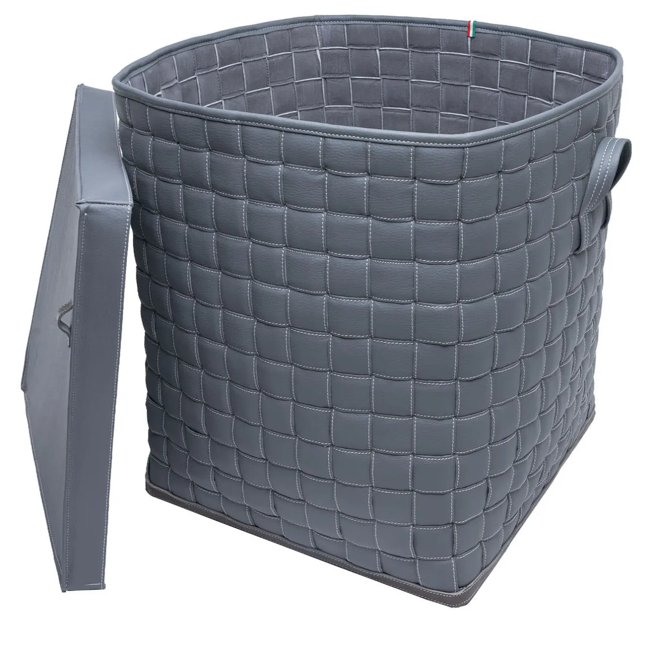 Sartorialità e praticità convivono inaspettatamente in questo esclusivo cesto per la biancheria. Ottenuto dall’accurata annodatura di fasce di ecopelle grigia, il suo design reticolare è intrigante sia alla vista che al tatto, mentre il coperchio coordinato e i manici sciolti sfoggiano un aspetto più tranquillo. I piccoli piedini montati sulla parte inferiore rigida lo proteggono dall’umidità e dallo sporco. Contattare il Concierge per conoscere le varianti di colore e dimensione disponibili.