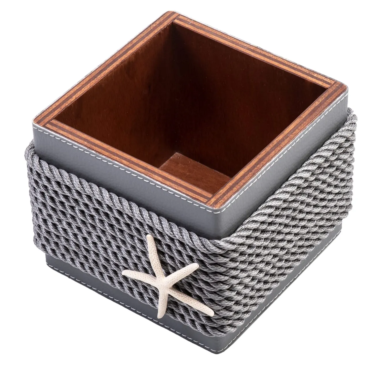 Deliziosa soluzione per conservare pot-pourri aromatici o prodotti di bellezza nelle case costiere, questa scatola in legno è avvolta da ecopelle grigia sui lati e ulteriormente ornata da corde nautiche. L’ispirazione marina è confermata anche dall’aggiunta di una decorazione a forma di stella marina che adorna la parte anteriore. Perfetto per completare l’arredamento di una barca, è un design esclusivo che abbina riferimenti sartoriali e nautici.