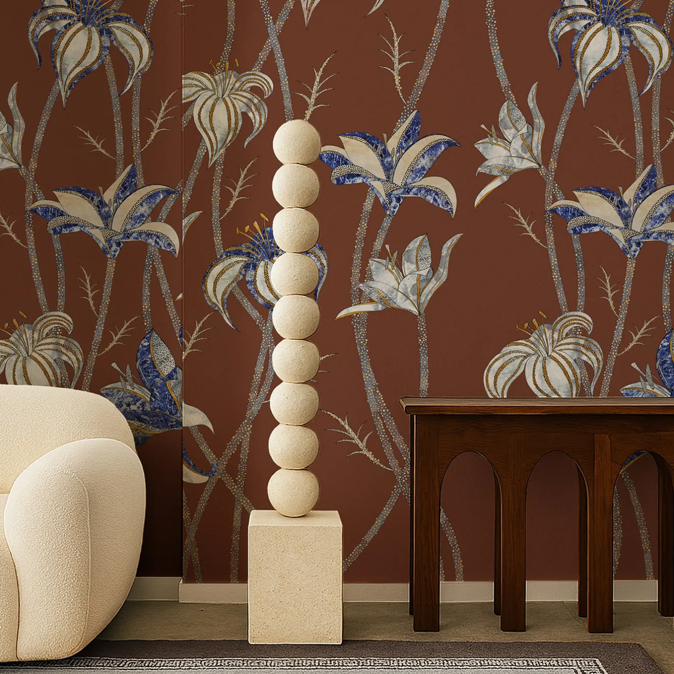 La carta da parati Fiori Terracotta raffigura lunghi steli sottili disegnati a mano che culminano in eleganti fiori di Lilium Lancifolium, ispirati all’antica tecnica decorativa della Scagliola. Questo metodo artigianale richiama l’aspetto di materiali preziosi come il Lapis Lazuli e il Quarzo Rosa, dando vita a un motivo sofisticato che fonde venature marmoree con suggestioni di pietre semipreziose. Stampata su carta ecologica di alta qualità in pura cellulosa con finitura opaca da disegno, fa parte della collezione Racconti. Il prezzo si riferisce al metro quadrato. Disponibile anche su altri supporti di stampa. Per ulteriori dettagli, si prega di contattare il Concierge. Design di Marika Tardio.
