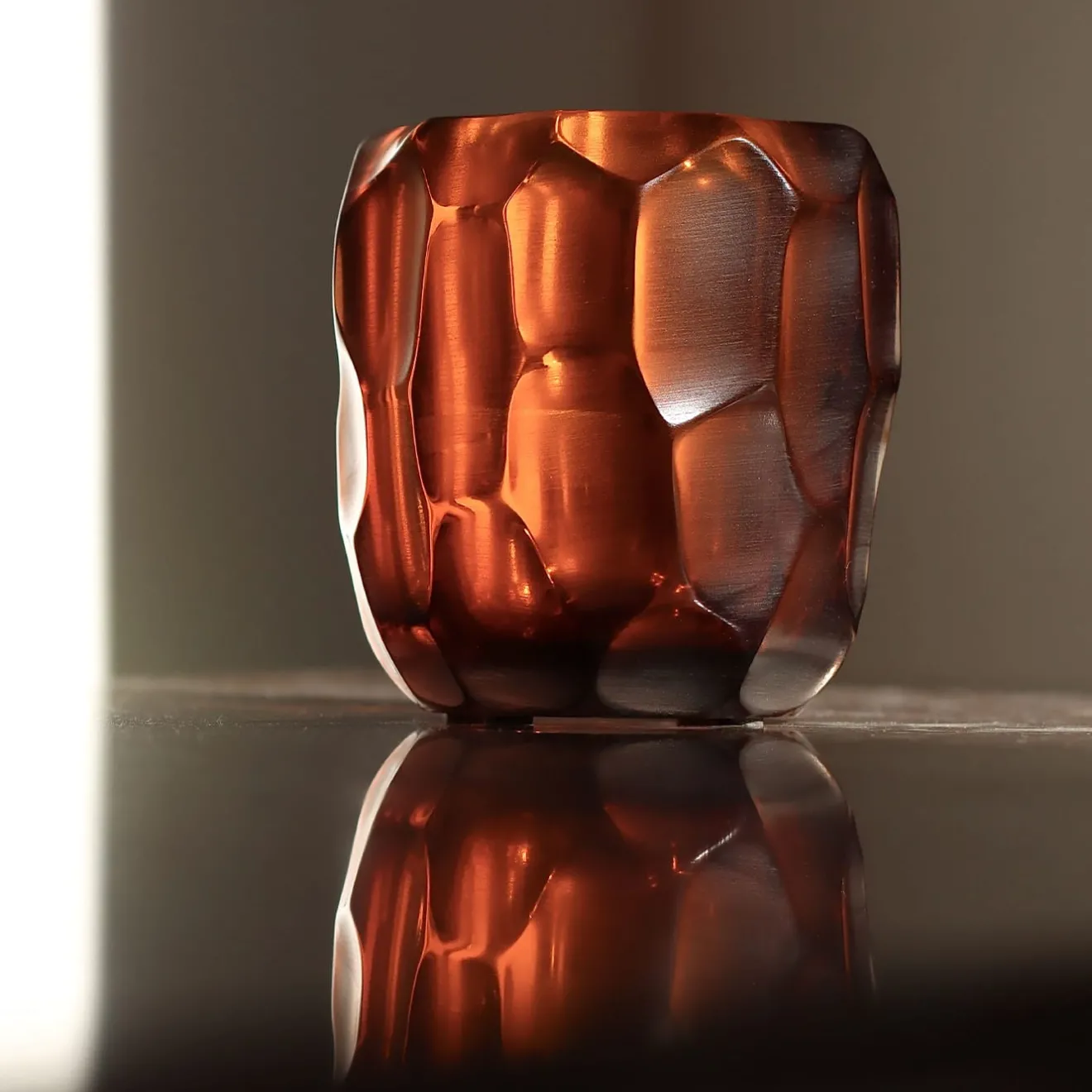 Il nome Rullo evoca l’atto di rotolare il vetro riscaldato sulla canna da soffio. Questo piccolo vaso viene prima modellato soffiando il vetro fuso e poi, una volta raffreddato, viene ulteriormente modellato intagliando la superficie. La lucidatura finale esalta le vibrazioni della luce sulla superficie incisa. Le diverse incisioni rendono l’esperienza tattile unica nel suo genere, permettendo inoltre alla luce di giocare con le superfici di vetro, riflettendo i colori in modo unico. Questo vaso è realizzato a mano e firmato.