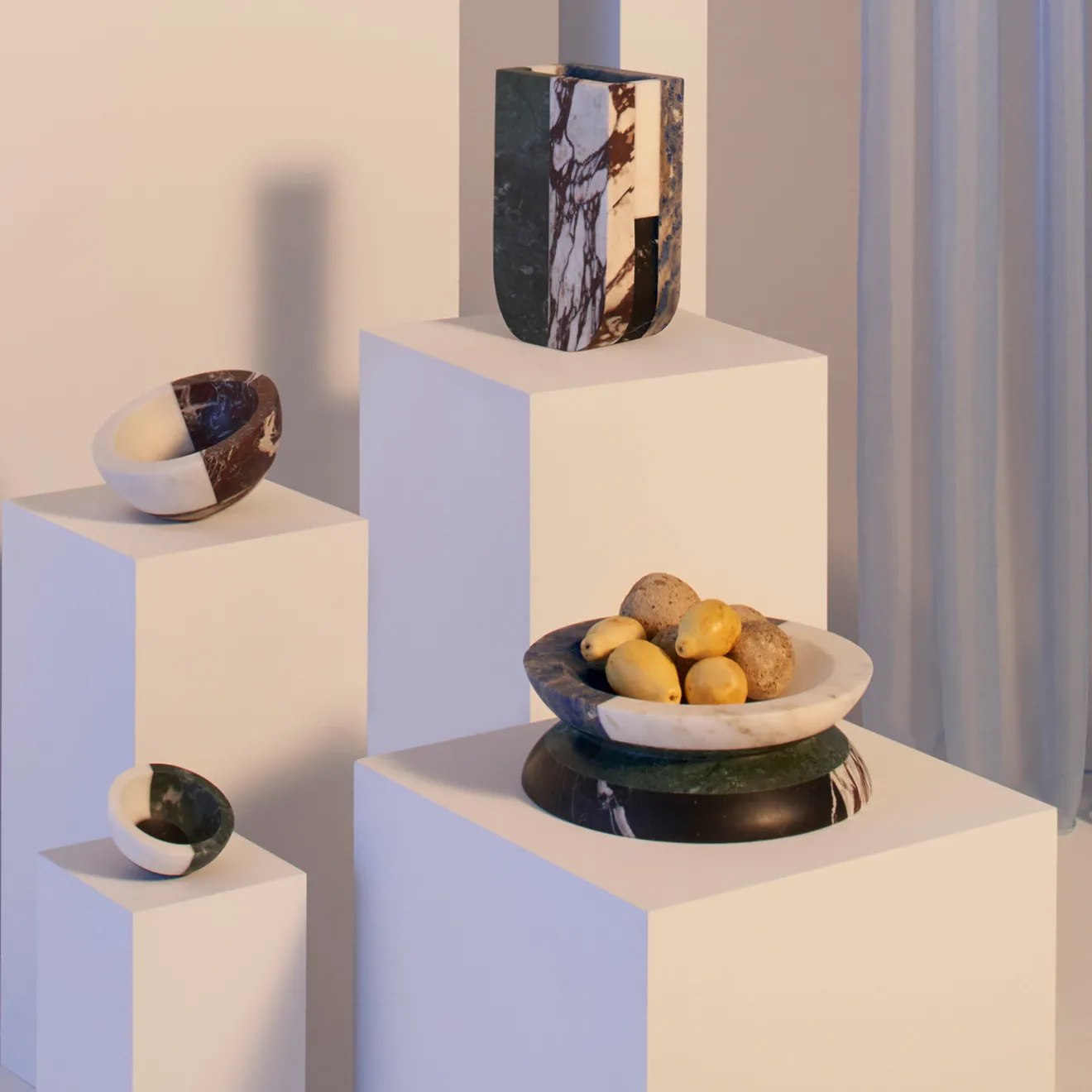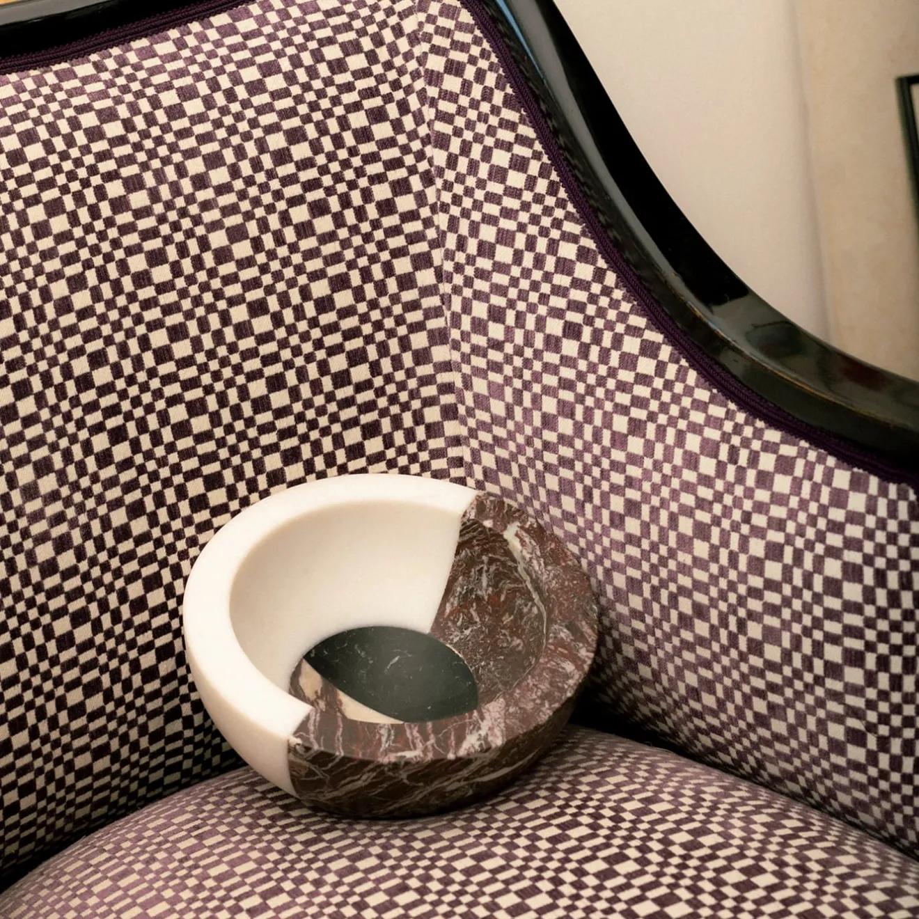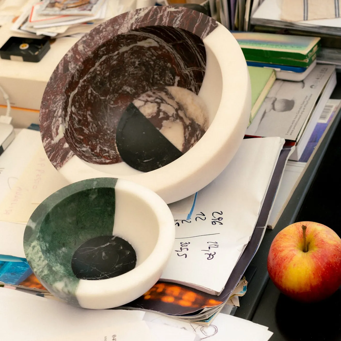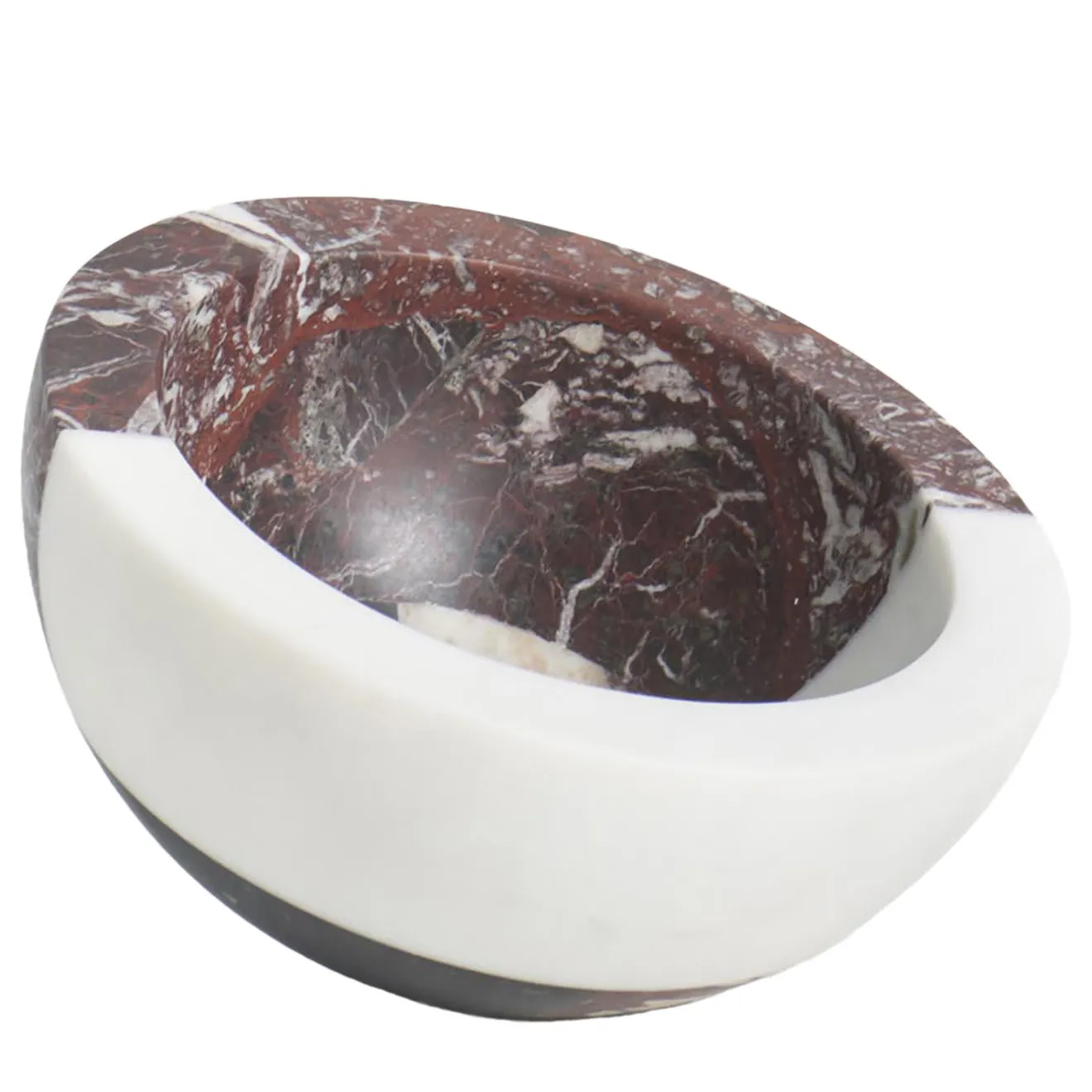 Un tocco scultoreo e contemporaneo pervade questa preziosa ciotola, oggetto raffinato che racchiude l’interesse del designer per volumi e tonalità audaci ma eleganti. Il suo design semisferico colpisce per l’equilibrio ingannevolmente instabile, reso ancora più intrigante dall’accostamento di diversi tipi di marmi in conflitto tra loro per venature e colori: nero Marquina, rosso Levanto, bianco Michelangelo e Arabescato Vagli Filo Rosso. Il pezzo non è impermeabile al 100% a causa dell’utilizzo di marmi diversi. Si ricorda che i marmi e le pietre sono materiali naturali e possono differire anche se provenienti dalla stessa cava o dallo stesso blocco. Il prodotto mostrato può differire dagli articoli acquistati. Ogni pezzo è unico. Questo articolo ha fatto parte della , in esposizione presso fino a maggio 2023.