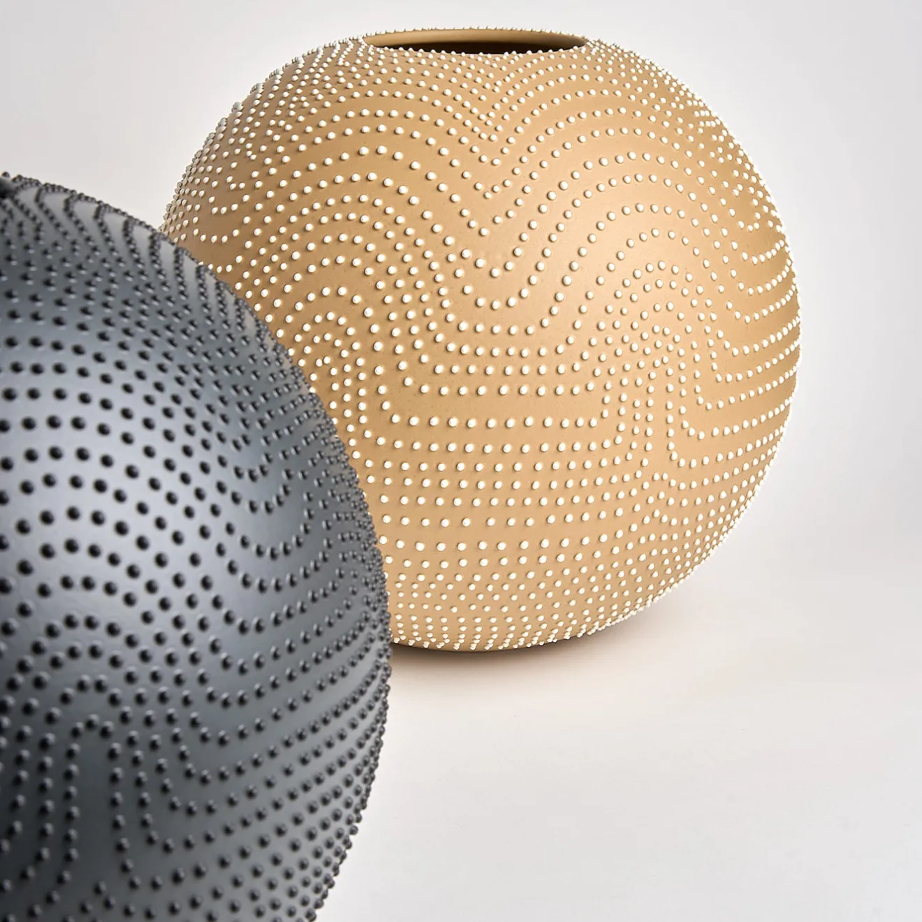 Arkadia è la regione greca favolosa per il suo scenario di vita idilliaco. Essenziale, arcaica, pura, una forma preistorica, un archetipo sempreverde dove la sfera rappresenta il “ventre”, l’accoglienza, la rotondità, il femminile, lo zero, il campo per tutte le possibilità. “Il Riccio/il riccio” viene reinterpretato recuperando un antico mandala sacro che rappresenta il “seme”, l’origine, il maschile, il primo principe, la gemma riproduttiva. Dedicato a tutte le vite “sacre” di questa terra.