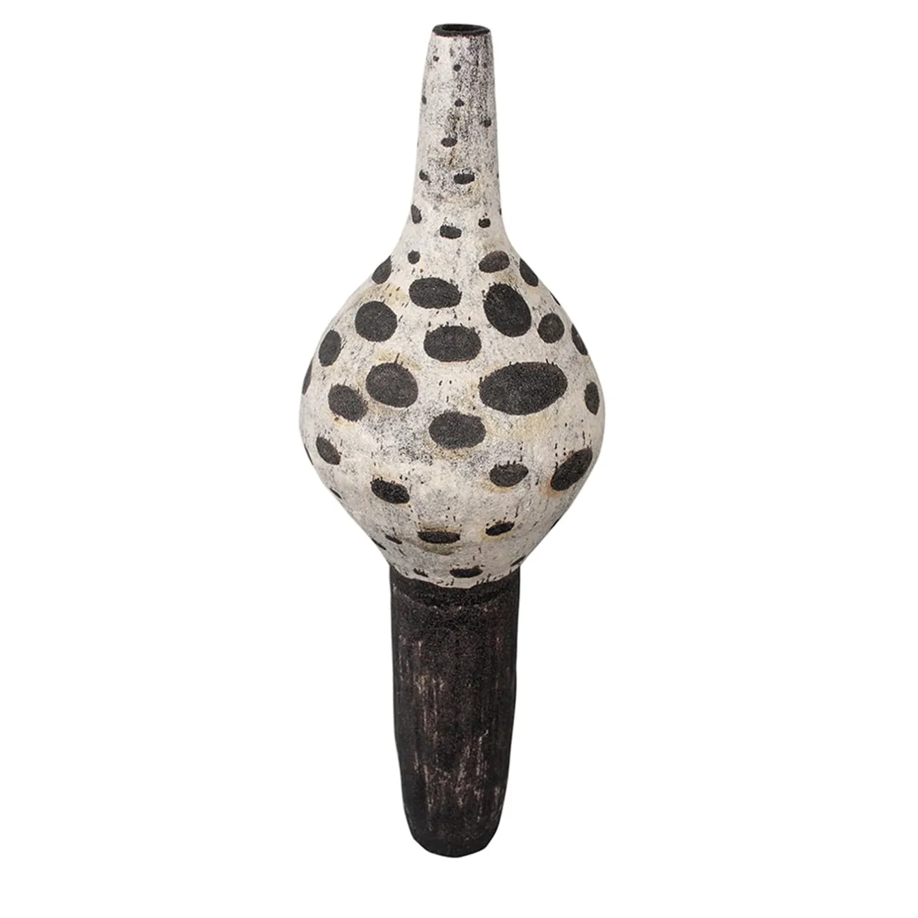 Ricco del fascino di un vero e proprio oggetto d’arte, questo vaso è una soluzione intelligente per ospitare fiori e sedurre con il suo aspetto scultoreo e irripetibile. Sapientemente lavorato e dipinto a mano, presenta una silhouette rigonfia al centro e drammaticamente affusolata alla base – accentuata in nero – e al collo, con una bocca (Ø 4 cm) che ricorda il cratere di un vulcano. Un motivo a puntini irregolari caratterizza la parte superiore, rifinita con smalto lucido e tratti grafici color manganese.
