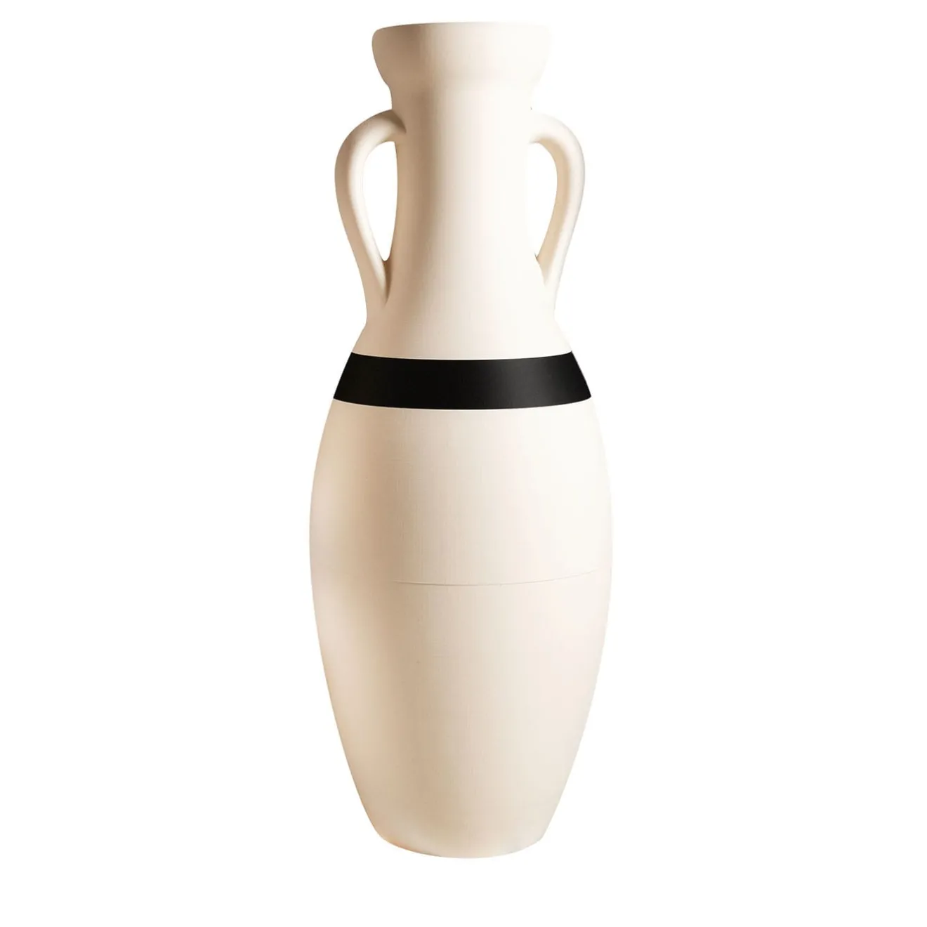 Reinterpretazione pop di un design archetipico. Questo vaso si ispira alla tipologia dell’anfora romana di Heinrich Dressel, basata sui reperti del sito archeologico di Monte Testaccio a Roma. Realizzato con la tecnologia della stampa 3D, trasforma i filamenti di PLA in un’iconica silhouette classica. Realizzato esclusivamente con PLA di alta qualità, una termoplastica derivata da risorse rinnovabili e compostabile in impianti industriali. Il vaso presenta un’elegante combinazione di colori latte e nero.