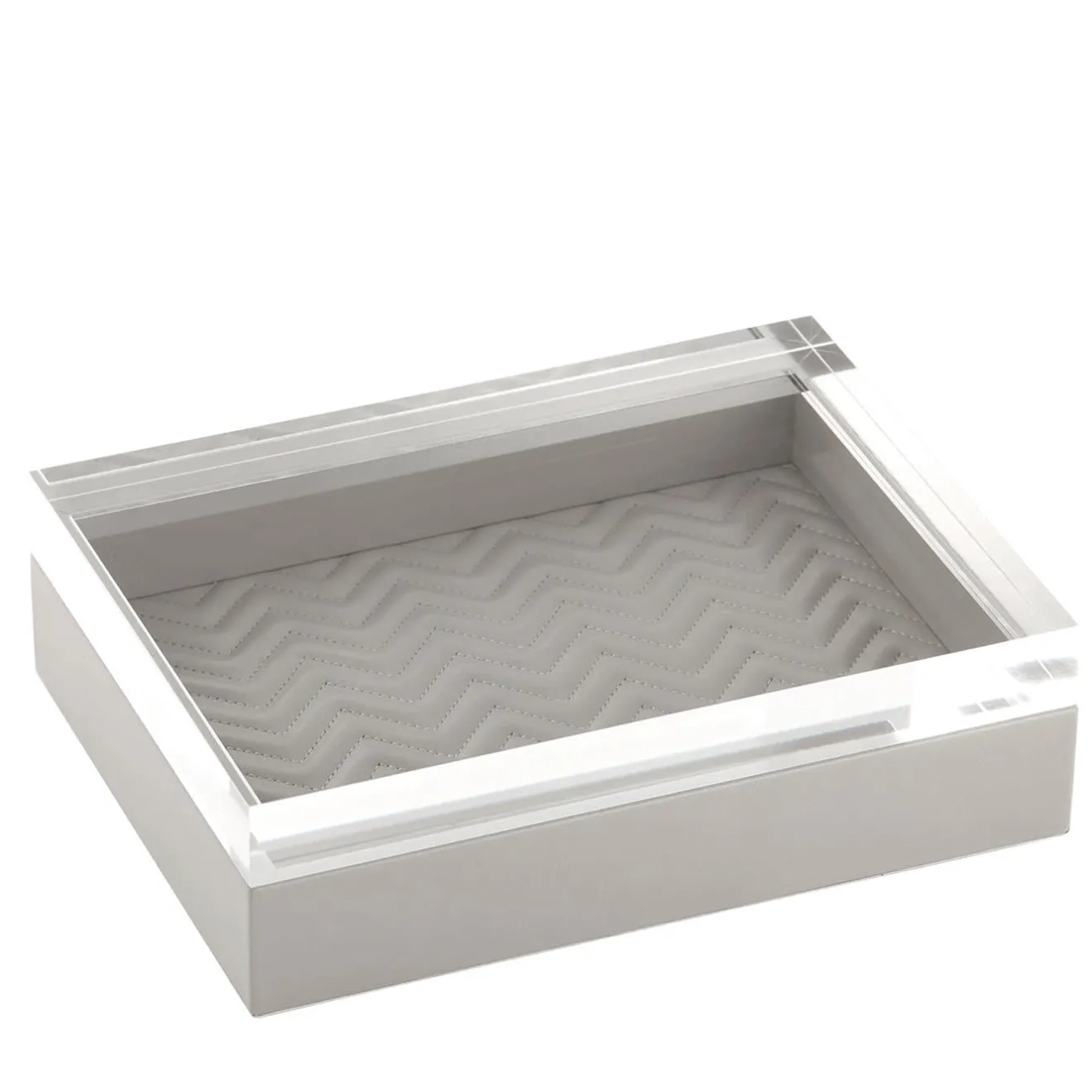 La scatola Febe con coperchio in acrilico presenta una linea semplice e formale, arricchita da una fodera imbottita a spina di pesce trapuntata. È perfetta per tutti i tipi di ambienti, da quelli classici a quelli moderni.