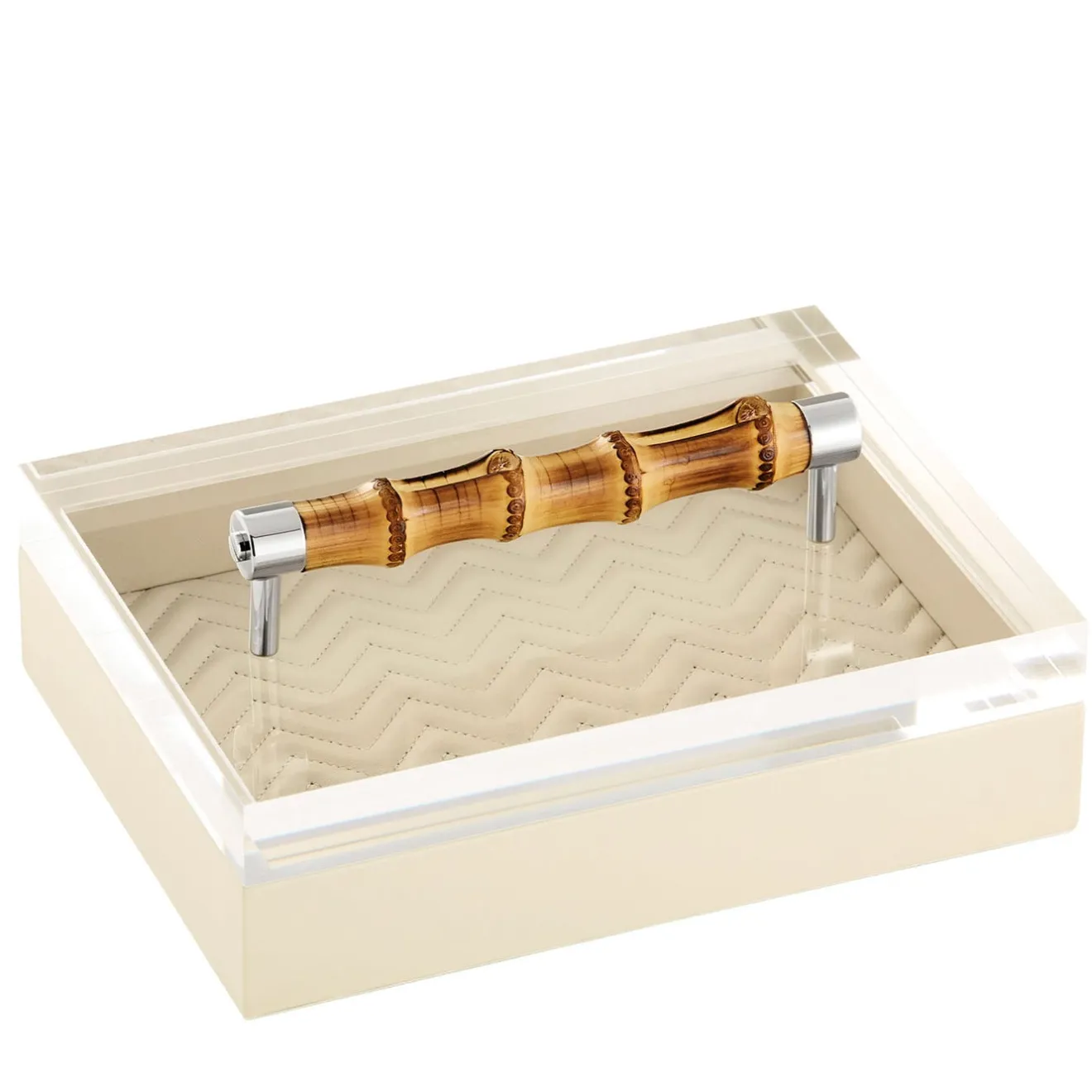 Questo elegante e versatile cofanetto rivestito in pelle, parte della Collezione Frida, è una testimonianza di raffinata artigianalità ed eleganza senza tempo. Presenta un coperchio in acrilico con manico in bambù e una fodera imbottita a spina di pesce trapuntata.