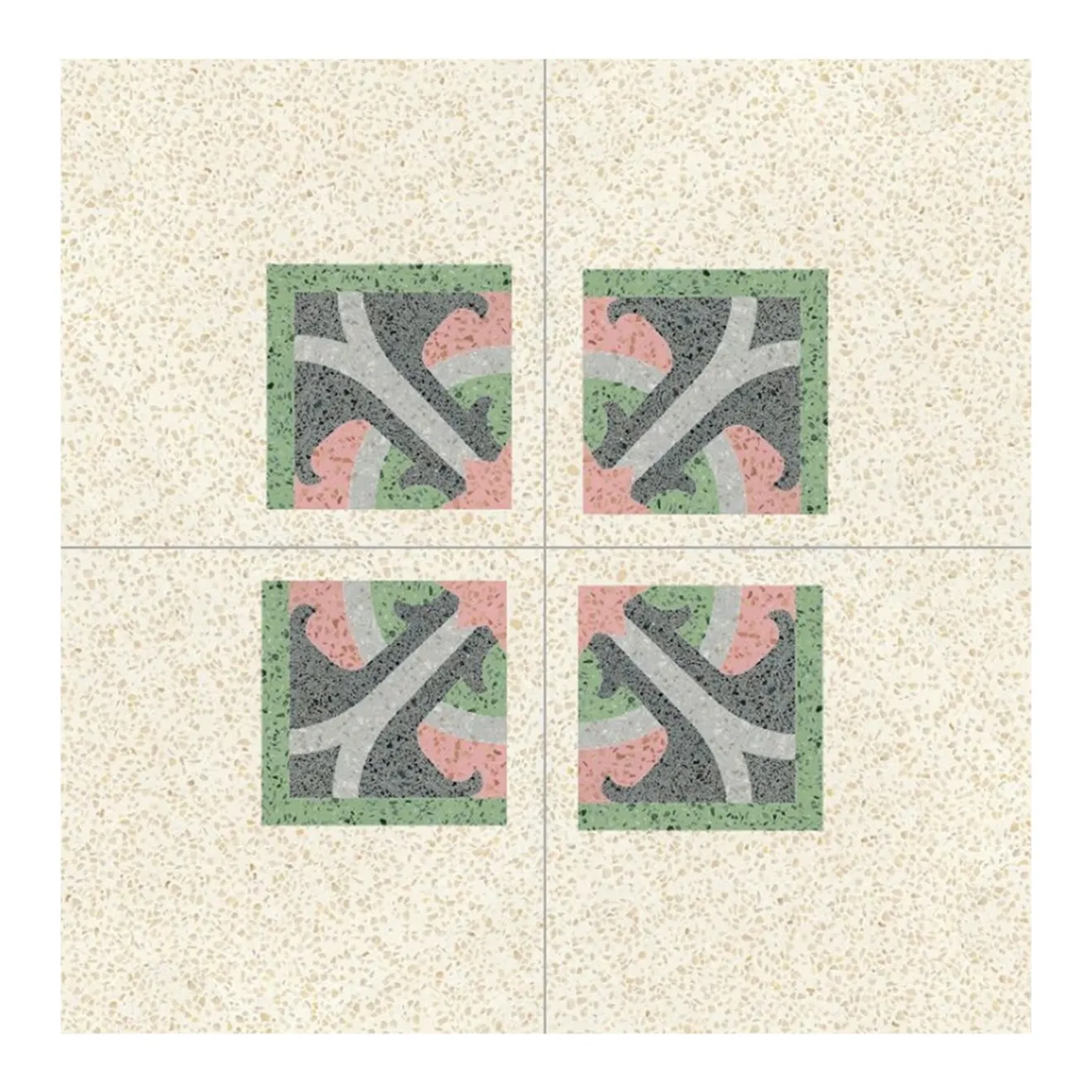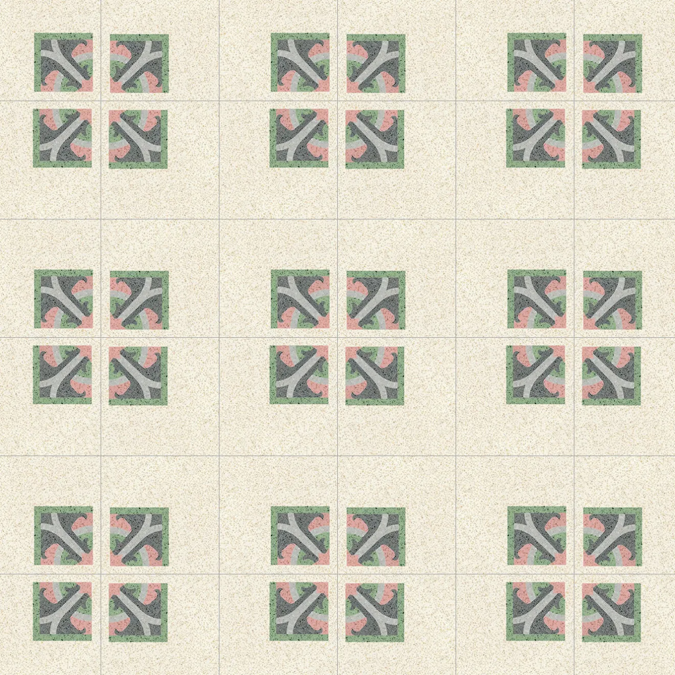 Realizzati a mano nel laboratorio siciliano di Romano utilizzando tecniche tradizionali, questi pavimenti in terrazzo sono realizzati con un’attenta miscela di cemento, granuli di marmo e sabbia vulcanica dell’Etna. Ogni piastrella è decorata a mano con un motivo geometrico che presenta forme quadrate in verde, grigio e rosa antico, su uno sfondo raffinato di bianco perla—una vera vetrina della maestria artigianale. Le piastrelle sono vendute al metro quadrato, con ogni metro quadrato che include 25 piastrelle.