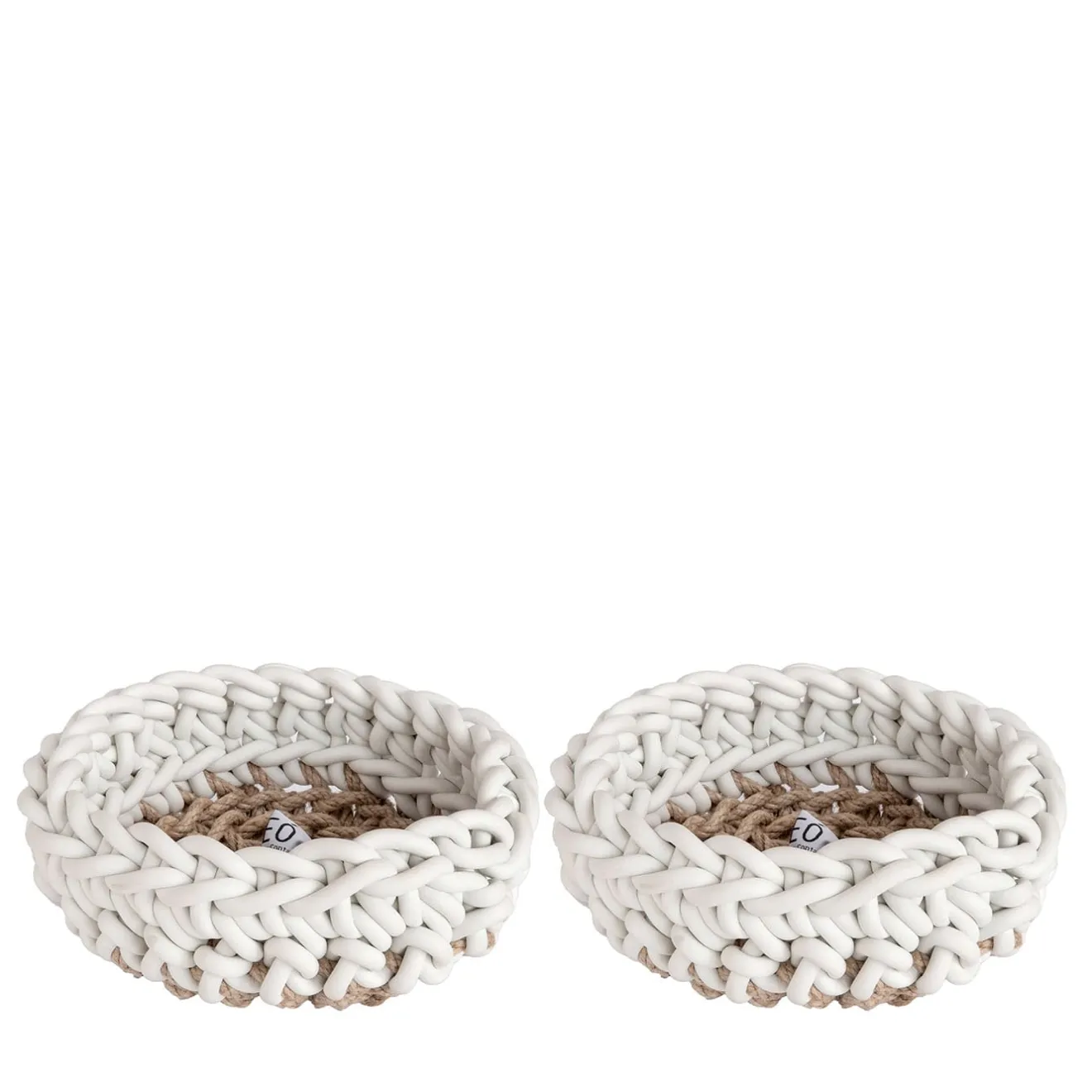 Un insieme di due nidi lavorati a mano con filato di canapa naturale è sormontato da un corpo lavorato all’uncinetto in filato di neoprene bianco di 8 mm di spessore in questo straordinario cestino, un design multiuso che combina texture contrastanti e toni sfumati. Disponibile in vari colori, consultare il catalogo Artemest per le opzioni.