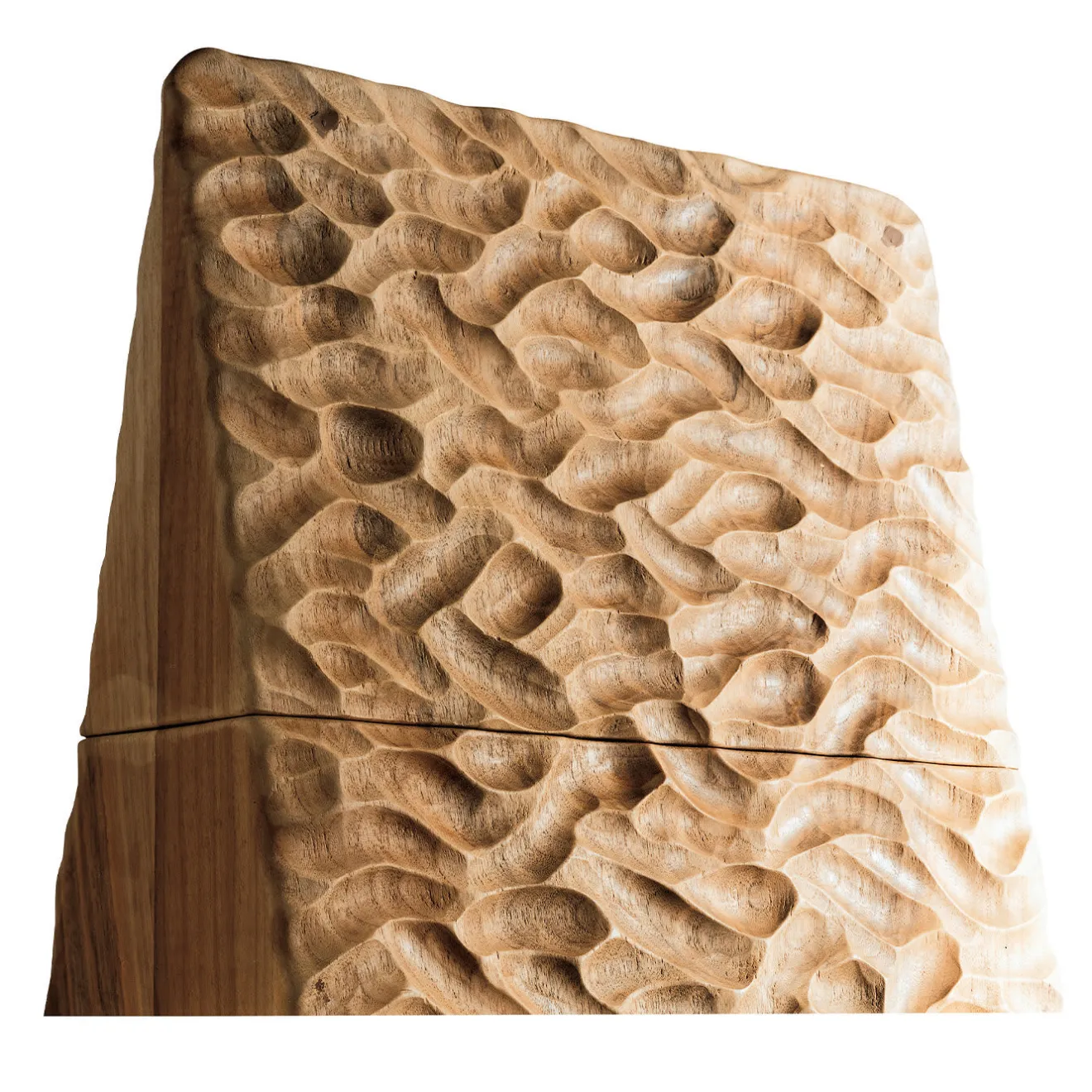 Disegnata da Giuseppe Rivadossi e superbamente lavorata da mani esperte, questa scatola è un oggetto raffinato e prezioso che mostra gli eleganti segni dell’artigianato. Appartenente a un’edizione limitata di 14 pezzi corredati da un certificato di garanzia, è interamente realizzato in legno di noce Juglans Regia tagliato nel 1994, lasciato essiccare per un periodo di sei mesi e poi lasciato per nove anni in un luogo protetto ma areato. La sua robusta silhouette piramidale è rifinita a mano con un effetto sbiancante e cera naturale per esaltare il gioco di luci e ombre creato dalla superficie strutturata.