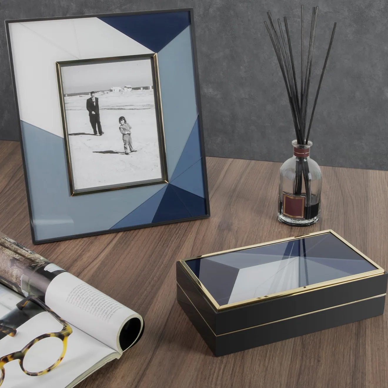 Ispirata ai motivi geometrici degli antichi pavimenti in marmo fiorentino, è disponibile in quattro varianti di colore: blu, rosé, trench e verde. La collezione è ulteriormente impreziosita da incastonature in ottone con finitura dorata.