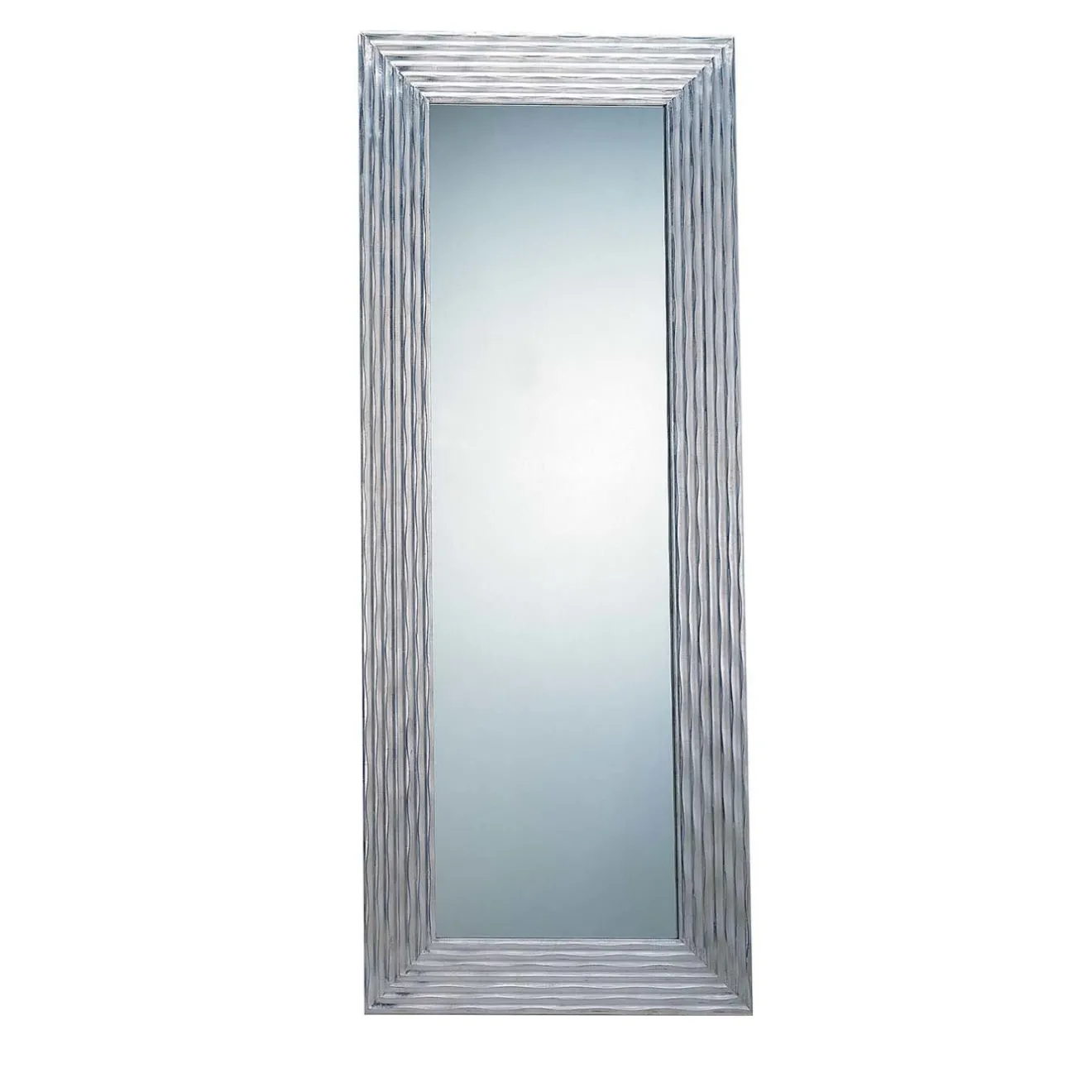 Questo specchio presenta una cornice con motivo a onde e una finitura in foglia di alluminio applicata a mano. La sua forma lunga e verticale lo rende perfetto per la camera da letto o l’ingresso, mentre il suo look elegante e minimalista e le sue tonalità fredde si adattano a qualsiasi ambiente.