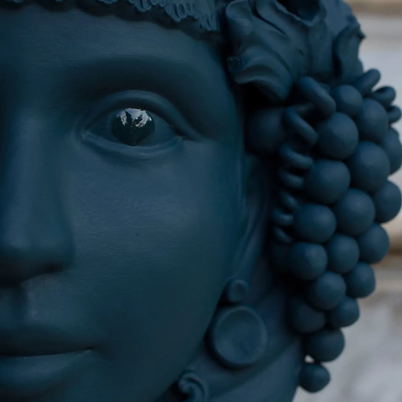 Questo vaso antropomorfo è realizzato interamente a mano e dipinto con una tinta monocromatica blu scuro opaca ricca di pigmenti naturali e leganti resinosi che conferiscono un’intensa profondità cromatica. Solo gli occhi sono smaltati per farli risaltare, enfatizzando la bellezza dello sguardo. Il pezzo si ispira alle antiche leggende siciliane di amore e vendetta tra un moro e una fanciulla. Il vaso non può essere riempito d’acqua.