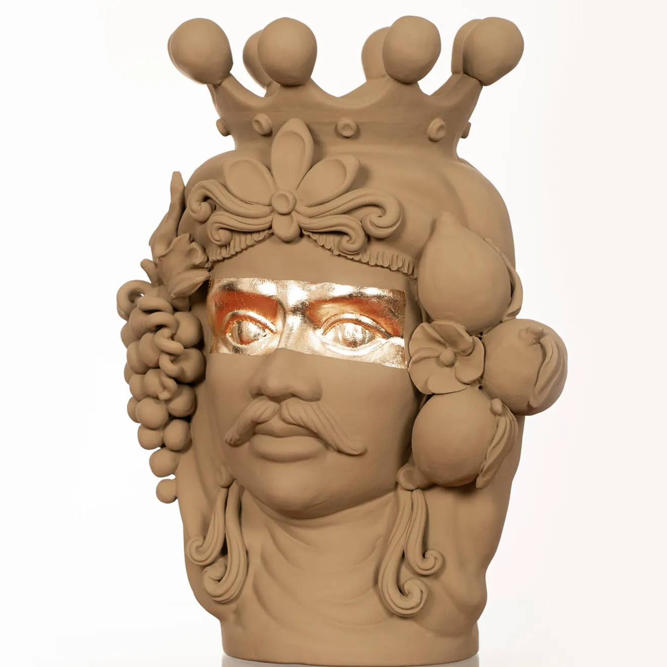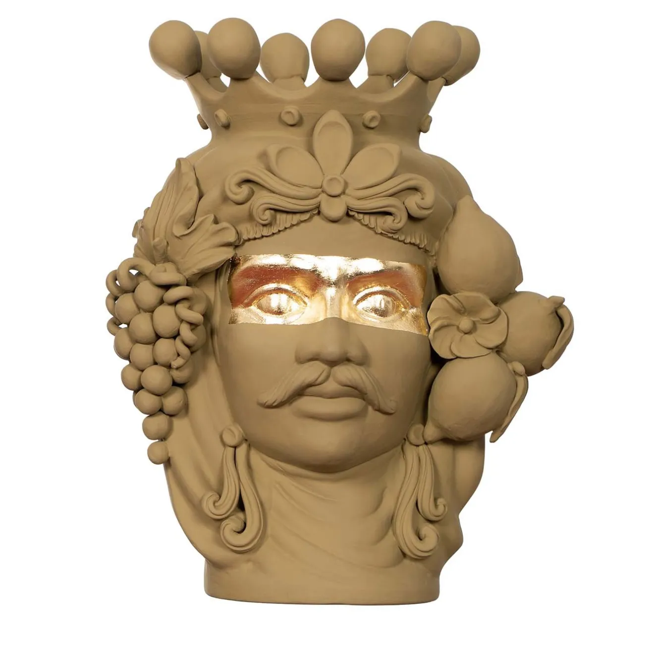 Questo splendido vaso spicca in un ambiente moderno o eclettico, dove costituirà una decorazione unica in ogni stanza e servirà anche come superbo contenitore per un’esposizione floreale. Realizzato interamente a mano secondo la tradizione siciliana delle sculture moresche, questo pezzo raffigura splendidamente un uomo con corona e decorazioni di frutta. I suoi lineamenti sono rifiniti con un colore verde opaco evidenziato da un inserto orizzontale in foglia d’oro che porta l’attenzione sugli occhi espressivi. Il vaso non può essere riempito d’acqua.