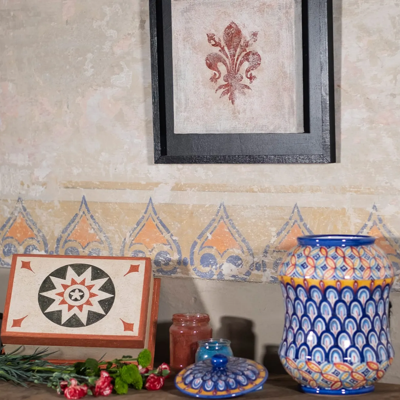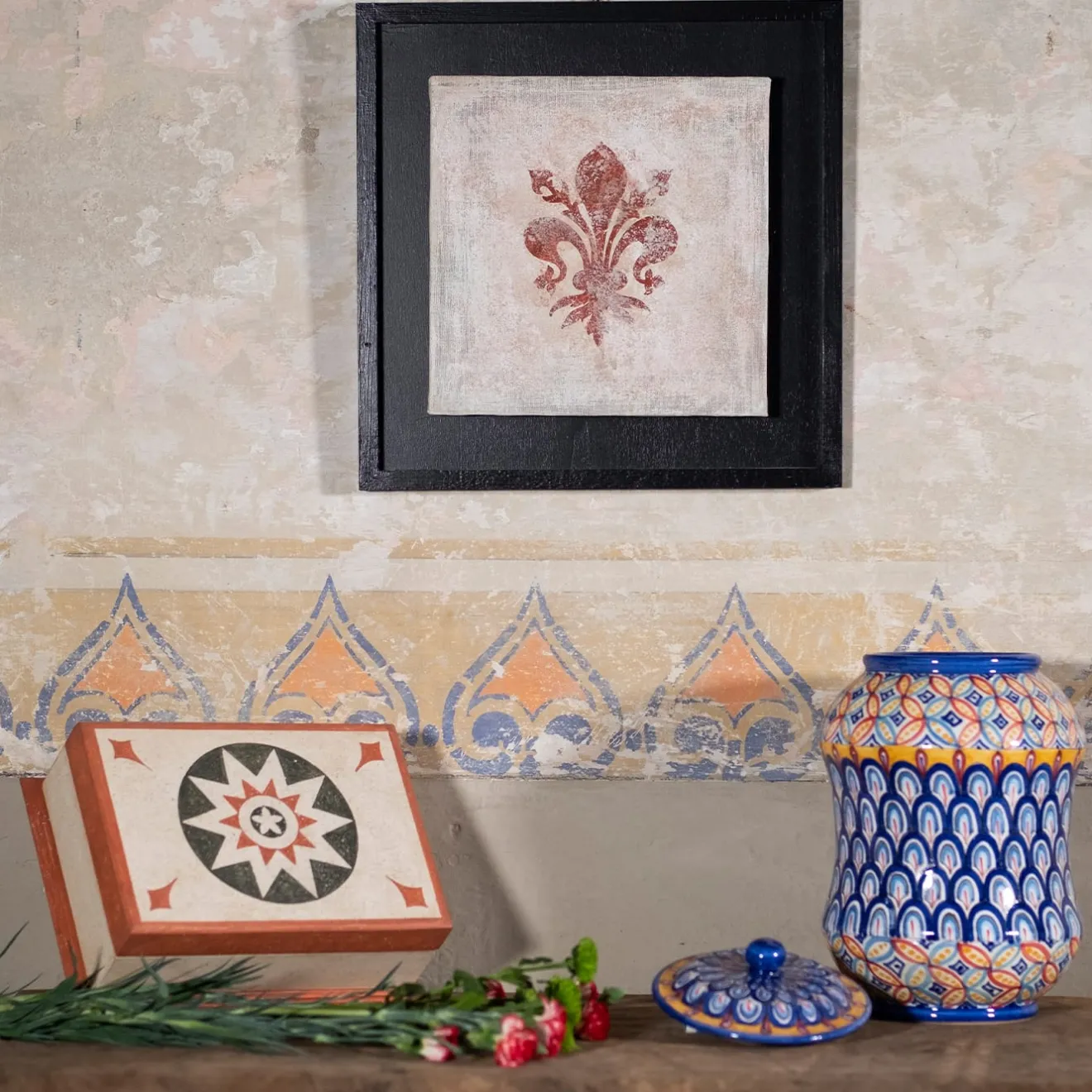 Decorativa e funzionale, questa scatola presenta una lavorazione tradizionale che spicca in un arredamento classico. La scatola rettangolare è realizzata in legno di recupero dipinto a mano con una tempera acrilica bianca, la cui texture marmorizzata è ottenuta con una tecnica di spugnatura in stile “encausto veneziano”, che si ritrova nelle facciate delle chiese rinascimentali. Il coperchio presenta una stella a otto punte verde e bianca in un cerchio rosso con fleur de lis verdi agli angoli. Il piedistallo smussato verde completa il bordo verde del coperchio per un semplice tocco finale. Il rivestimento in cera d’api aggiunge una finitura lucida e protettiva.