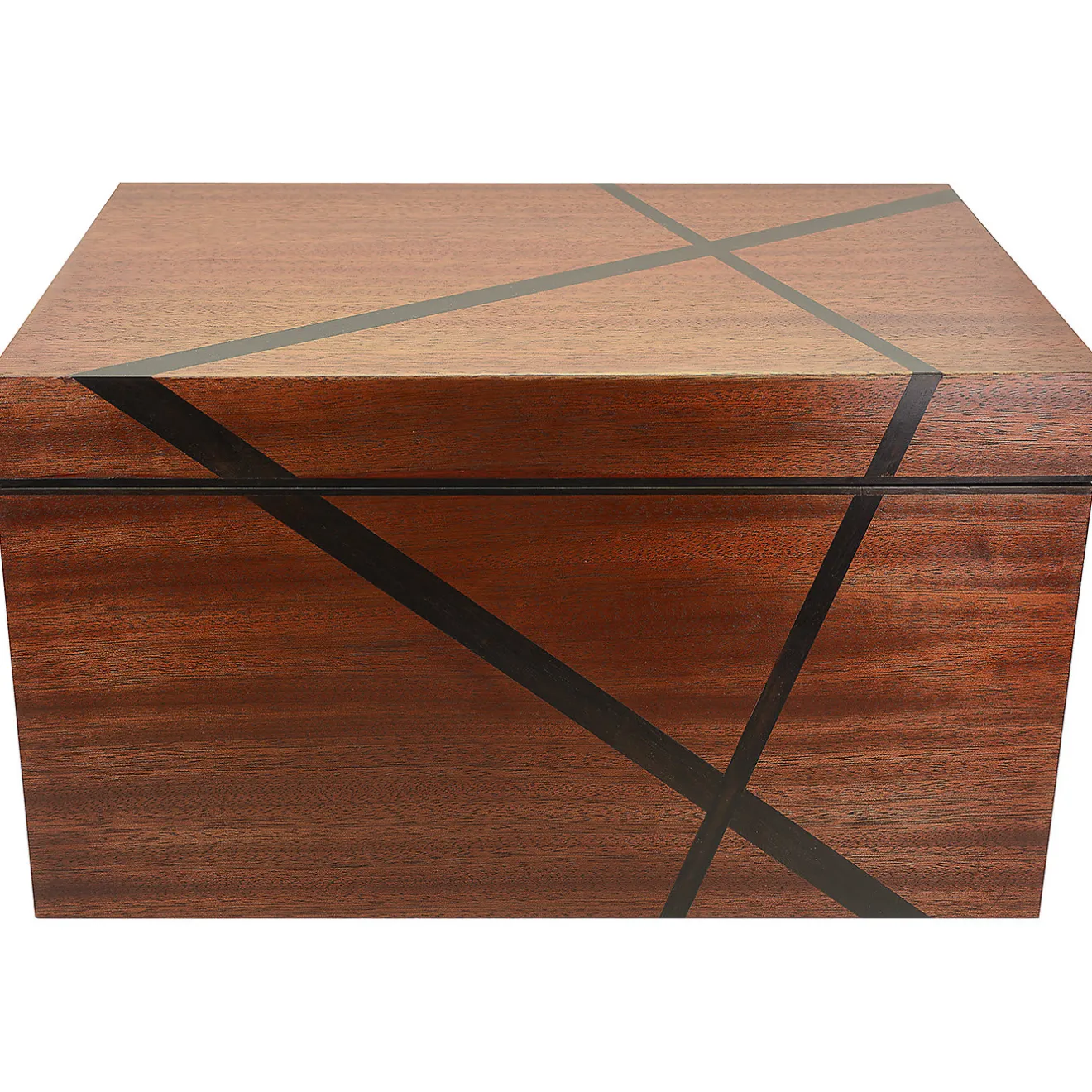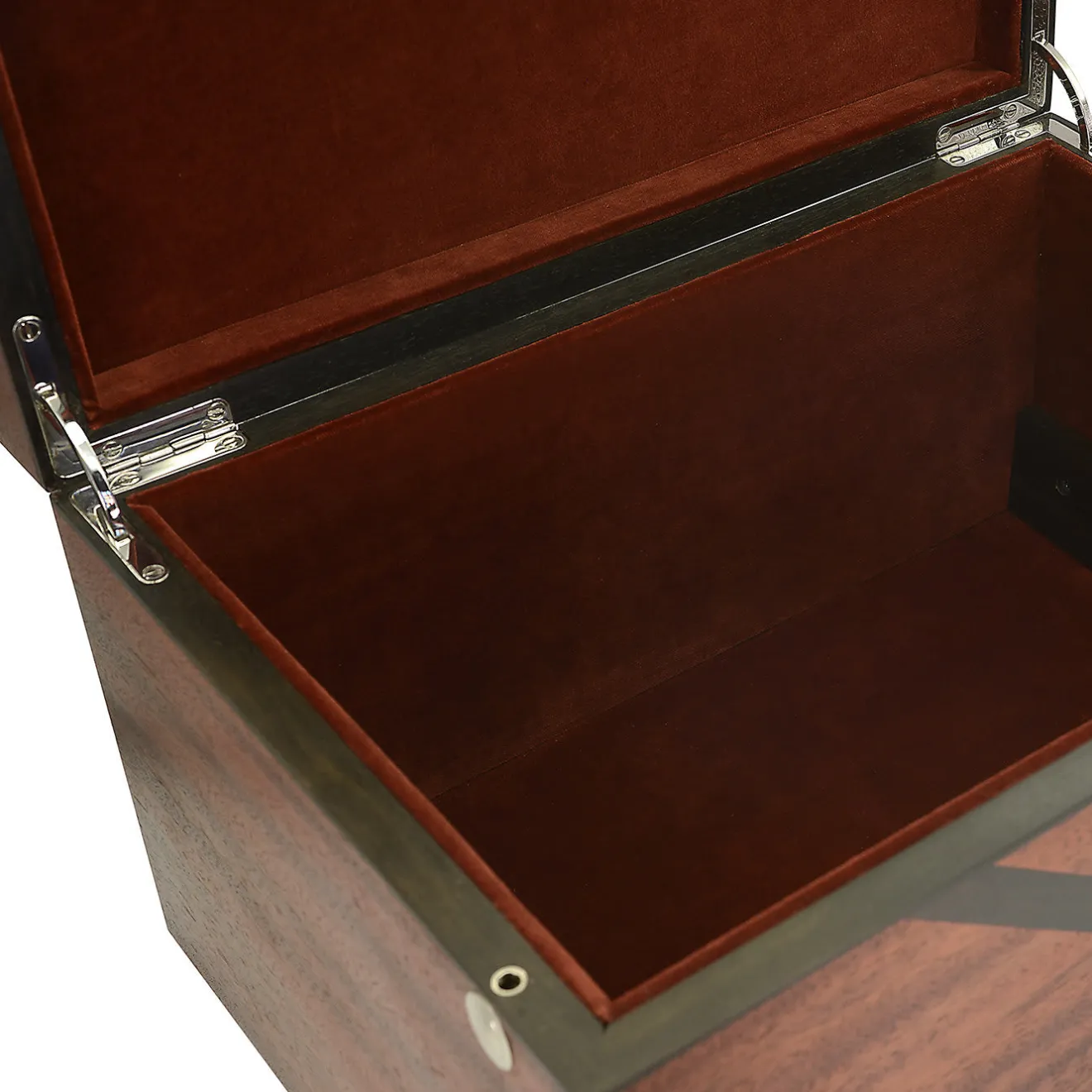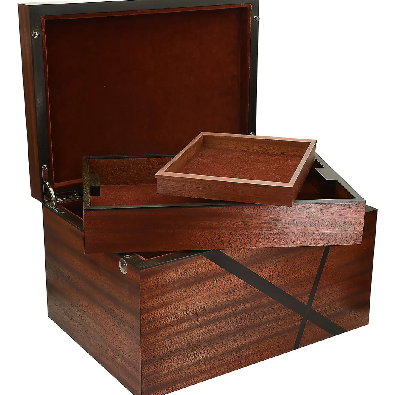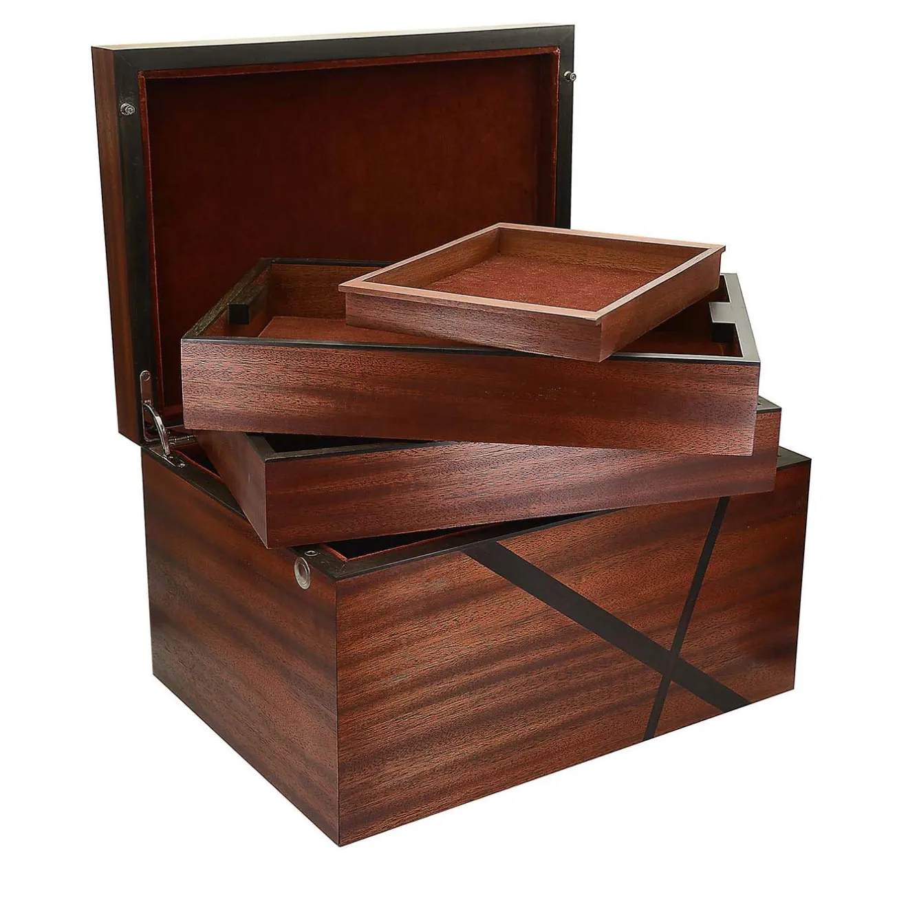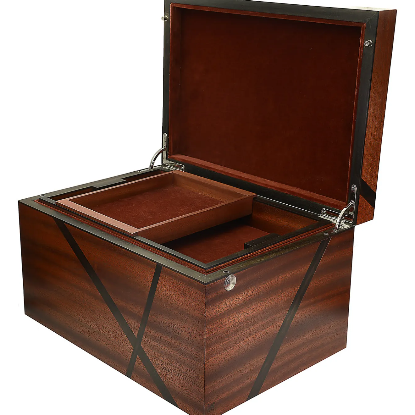 Questo elegante cofanetto è realizzato in mogano massiccio, con inserti decorativi in ebano. Foderato in velluto, l’interno contiene due grandi vassoi e un vassoio scorrevole più piccolo, tutti dotati dello stesso morbido rivestimento in velluto. Caratterizzata da una ricca tonalità marrone, la scatola in mogano ed ebano è un complemento decorativo e al tempo stesso ultra-funzionale per la casa.