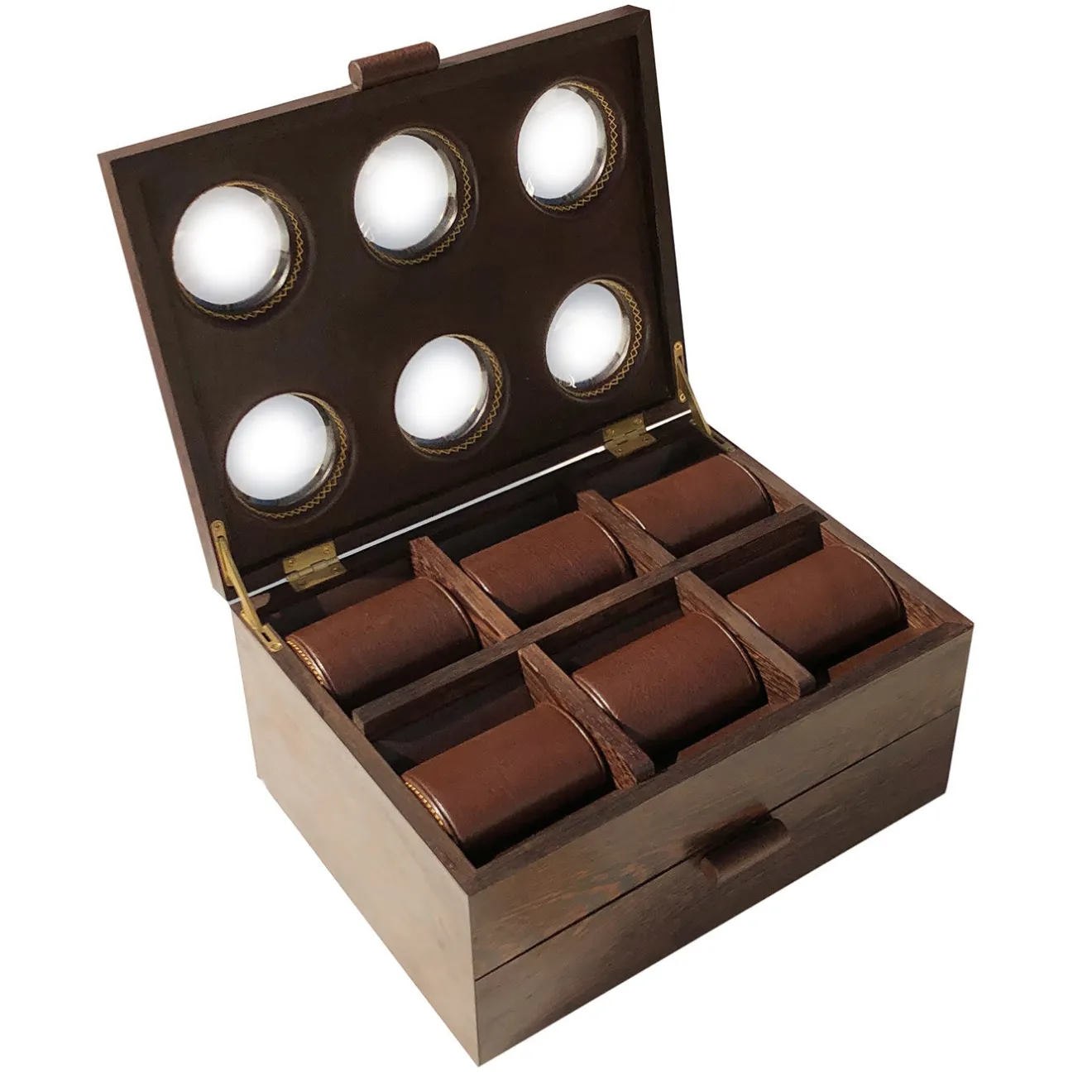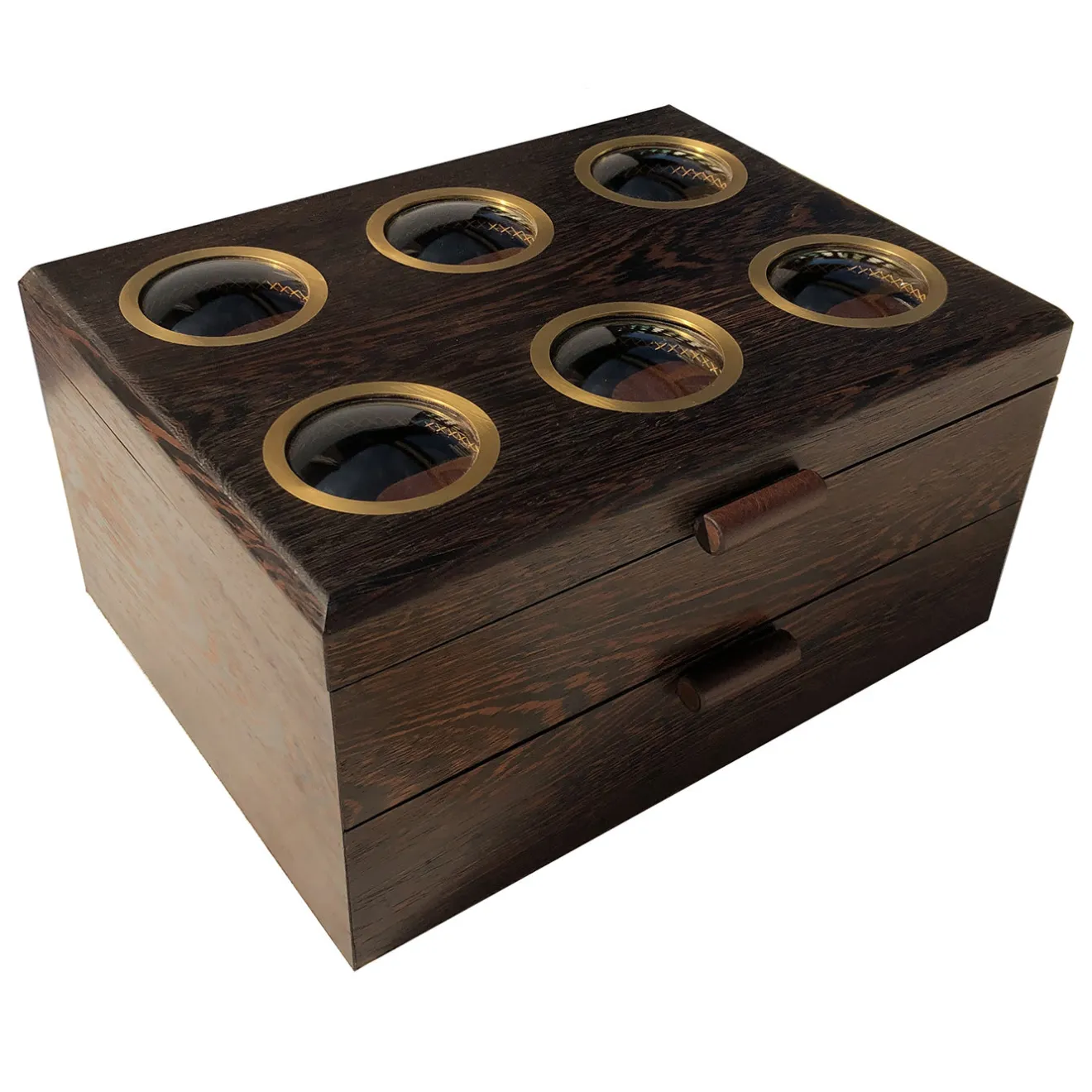 Realizzato in legno wengè con interni in pelle marrone, questo cofanetto non è solo un oggetto funzionale per proteggere gli orologi da collezione da graffi e danni, ma è anche un superbo pezzo decorativo su un comò della camera da letto o sulla scrivania dell’ufficio. Dal design semplice e classico, con un fascino elegante, questo cofanetto presenta un piano sollevabile con sei piccole finestre di vetro rotonde con un bordo rifinito in ottone. Progettato per contenere 12 orologi, il piano ha sei scomparti con cuscini in pelle, mentre il cassetto inferiore scorrevole presenta sei divisori orizzontali.