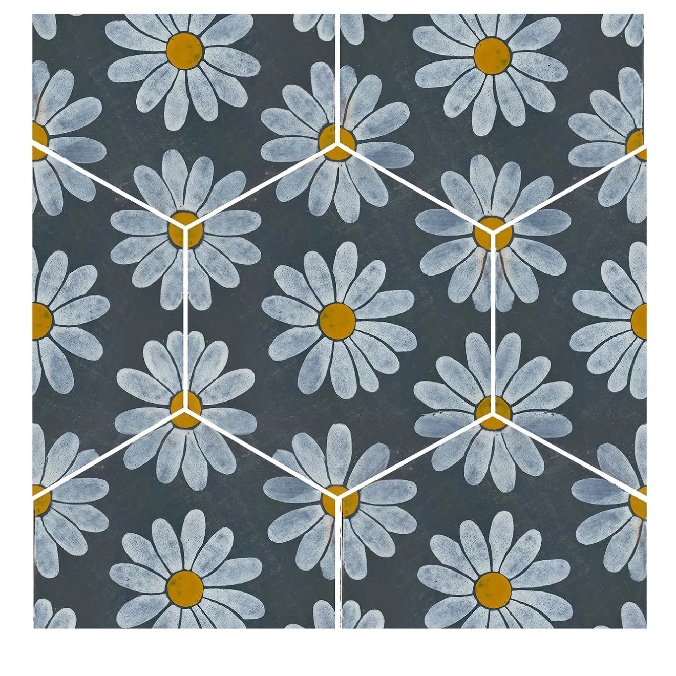 Questo set di quattro piastrelle esagonali in ceramica, ispirato alla flora del vulcano Etna in Sicilia, appartiene a una serie singolare e raffinata disegnata da Vincenzo Messina, che rende omaggio alle eccezionali sorprese offerte da Madre Natura. Ogni pezzo è smaltato e decorato da delicate margherite su uno sfondo grigio, e fa parte della collezione Kimeya di pezzi realizzati a mano in modo sostenibile.