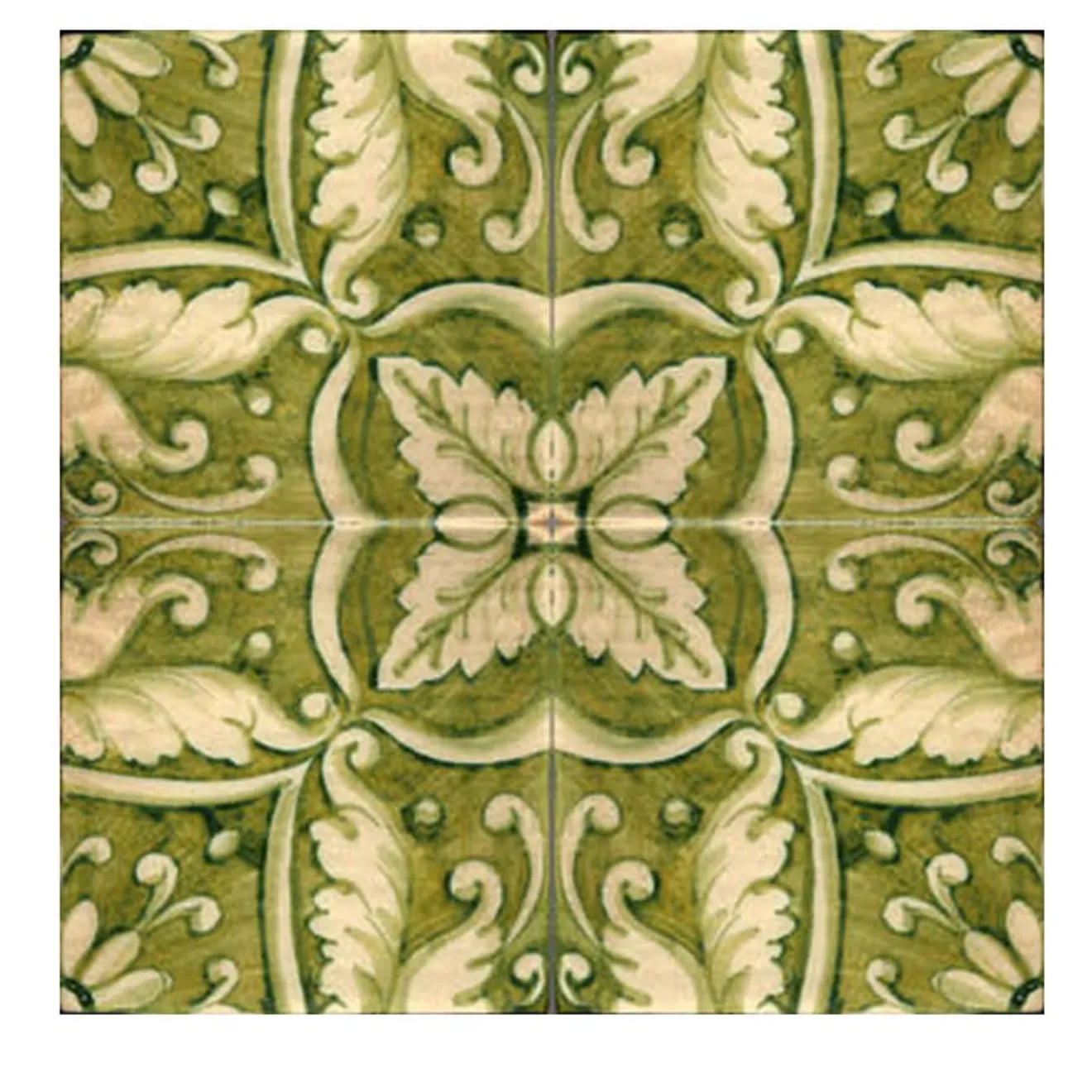 Una composizione semplice ma audace, questo versatile pannello in maiolica trasformerà qualsiasi arredamento moderno o tradizionale con la sua energia dinamica. Realizzate a mano secondo la tradizione della maiolica siciliana, queste quattro piastrelle si fondono per rivelare un design eccezionale che richiama l’eleganza del tardo Rinascimento. La simmetria è caratterizzata da audaci motivi a fronde in avorio su uno sfondo verde muschio. Sublimi volute incorniciano le fronde, aggiungendo un tocco di linearità a questa composizione sinuosa. Da esporre come pannello a parete o come pavimento in cucina, in bagno o all’ingresso, queste piastrelle faranno bella mostra di sé in ogni casa.
