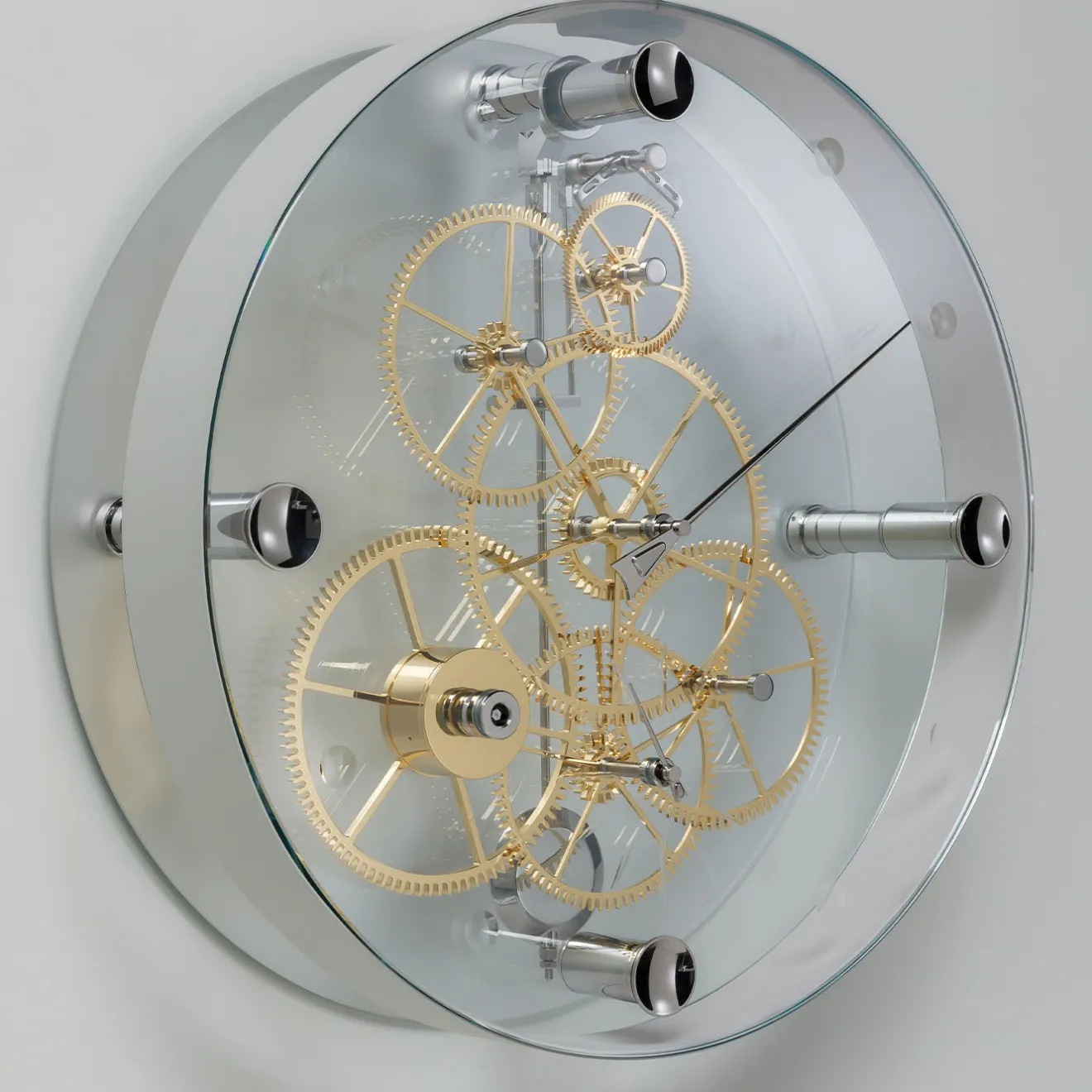 Il Takto Presto 02 presenta una struttura elegante realizzata in un sottile foglio di acciaio con una finitura bianca testurizzata e un interno rivestito in suede bianco. La sua piastra posteriore è realizzata in specchio extra-chiaro e acidato, che aggiunge profondità e luminosità. La struttura in vetro temperato extra-chiaro di 12 mm di spessore è incisa con indicatori di ore e minuti, lucidati con eccezionale precisione. Al suo interno si trova un movimento meccanico con un escapamento Graham e molle di sospensione. Ingranaggi e cremagliere, placcati in oro 24k e montati su pannelli di vetro con cuscinetti di precisione, garantiscono prestazioni raffinate. Frequenza: 5.400/h. Azionamento: molla principale.