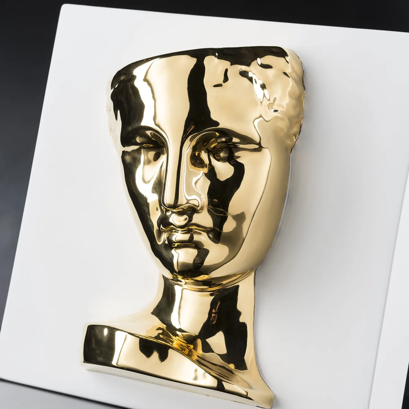 Questo impeccabile vaso unisce arte e artigianato in un oggetto unico e raffinato. Caratterizzato da un tocco contemporaneo, con il bassorilievo in oro 24k del volto di Psiche di Capua, questo splendido vaso rettangolare è realizzato magistralmente a mano in ceramica bianca.